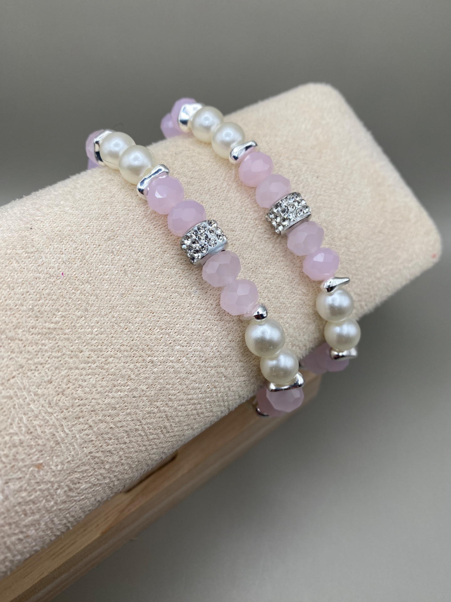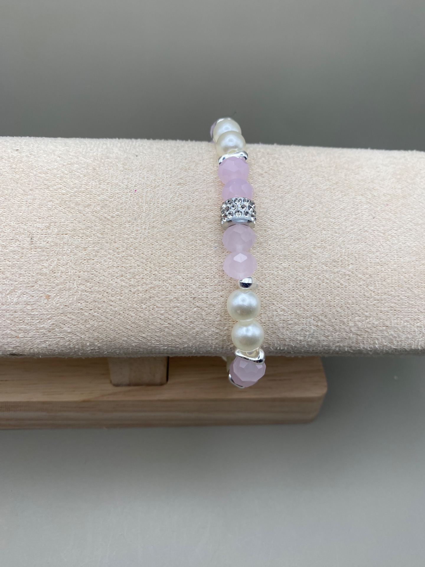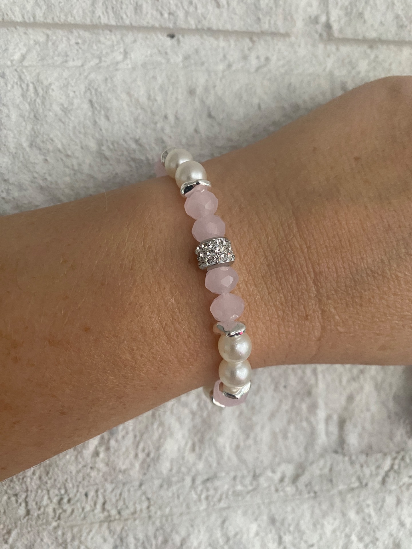 Vackert armband i varvat fasetterade ljusrosa stora glaspärlor med elfenbensvita högblanka pärlor och små silverfärgade distanser, vacker strassberlock i blickfånget och signaturpärla.