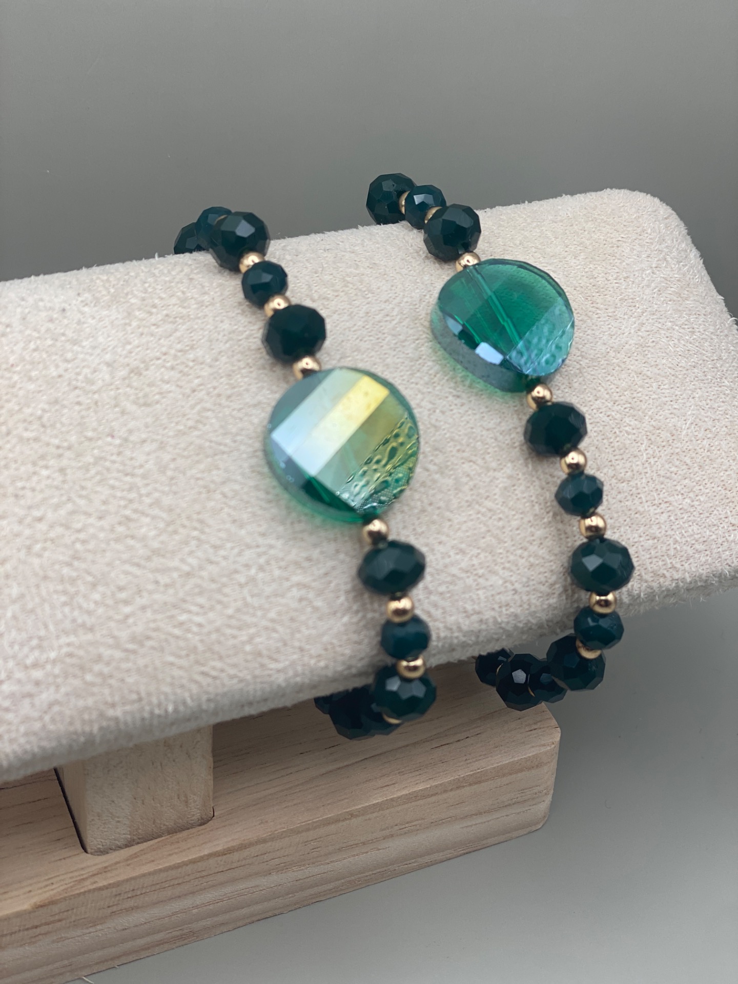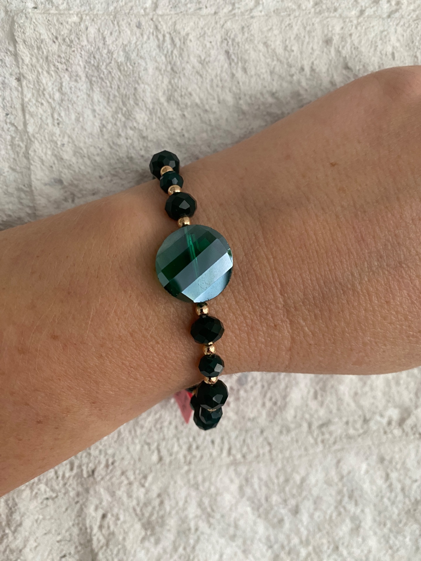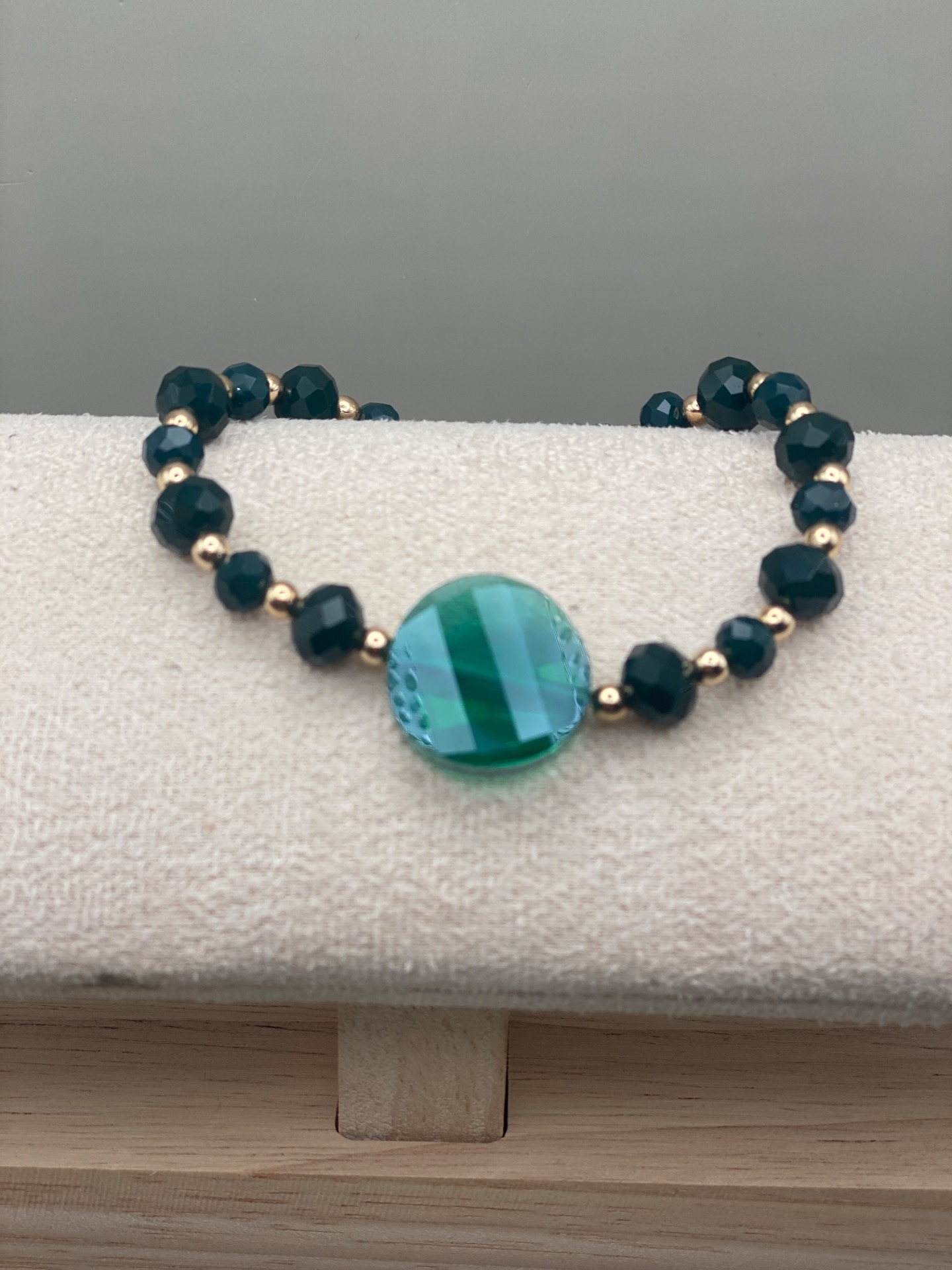 Skimrande lekfullt armband i varvat facetterade mörkgröna glaskristallpärlor i olika storlekar och små guldfärgade distanser. Stor vacker grön glasberlock i blickfånget och avslutas med min signaturpärla.