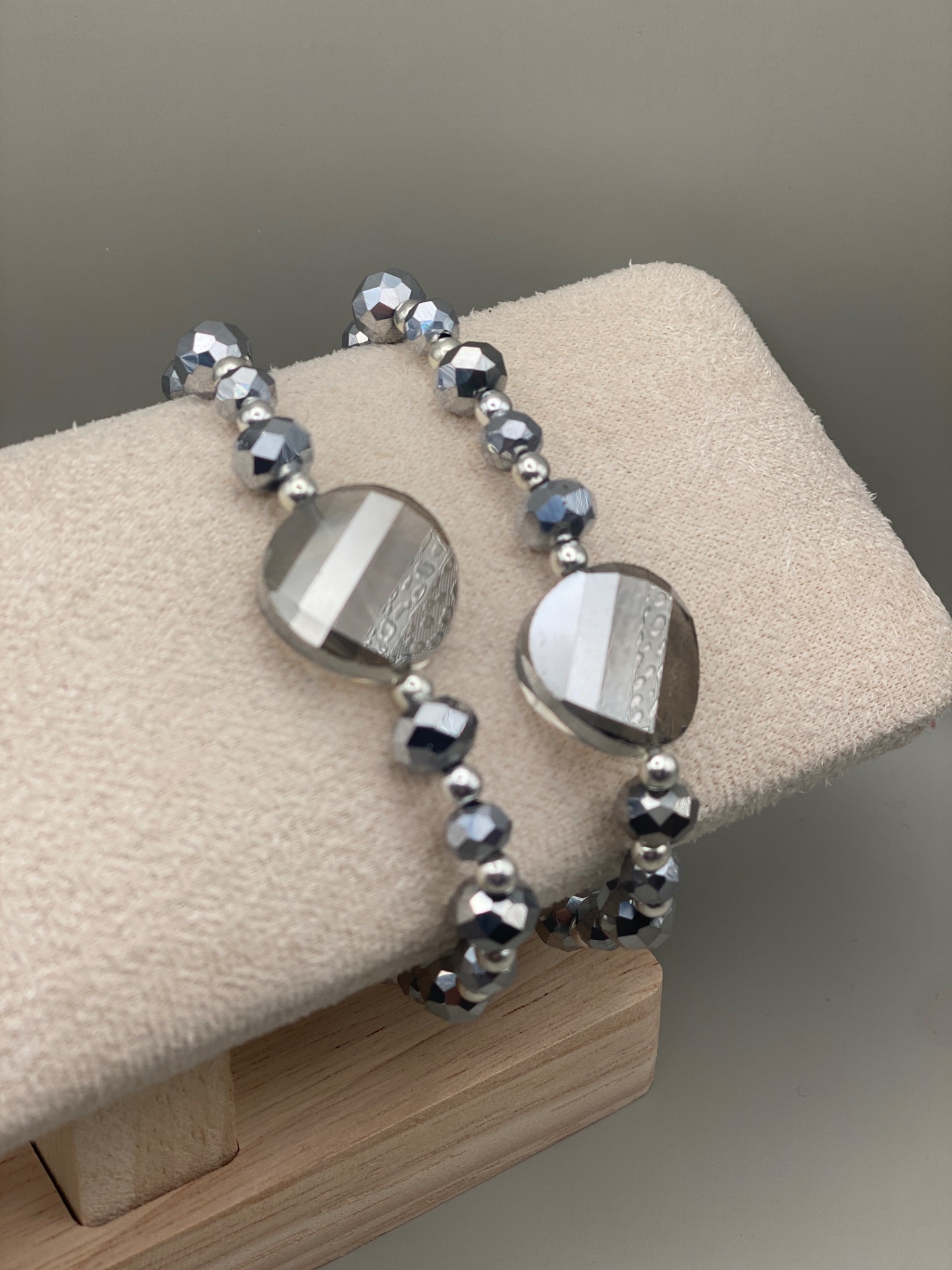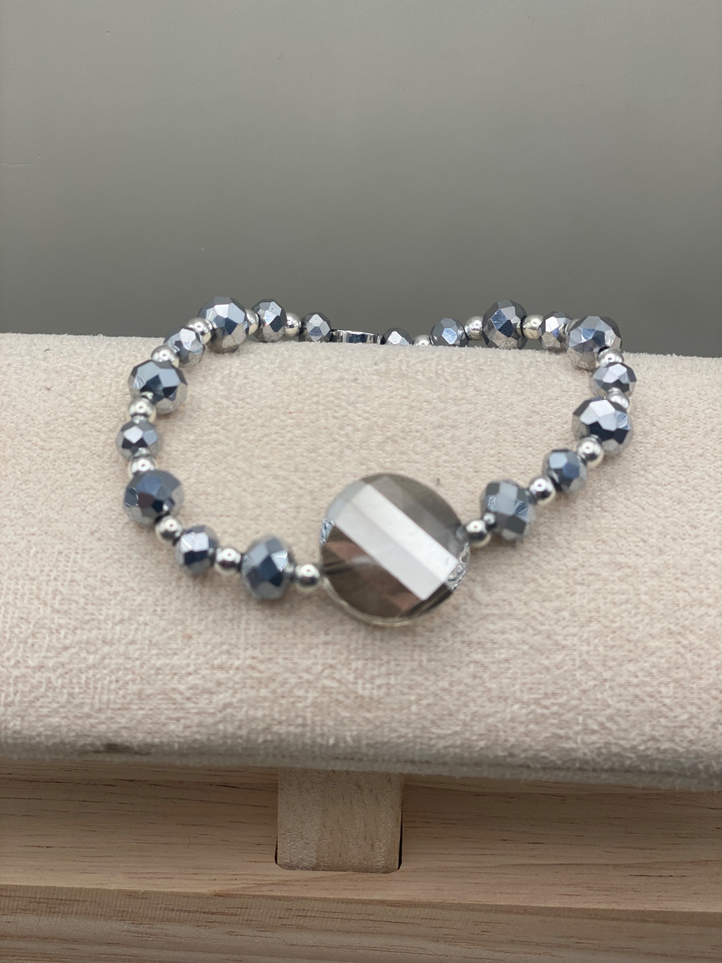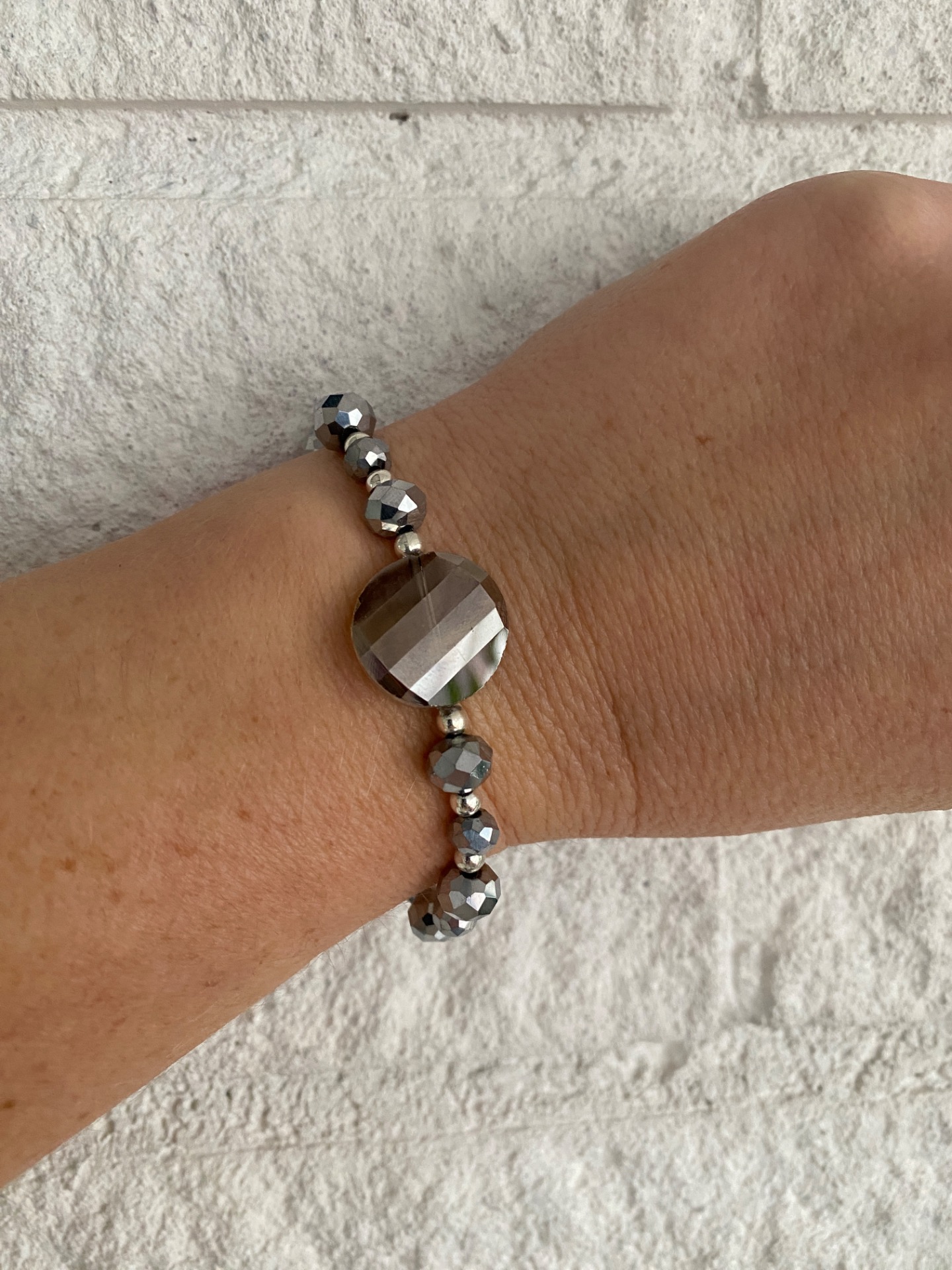Skimrande lekfullt armband i varvat facetterade högblanka stålgrå glaskristallpärlor i olika storlekar och små guldfärgade distanser. Stor vacker grå glasberlock i blickfånget och avslutas min signaturpärla.