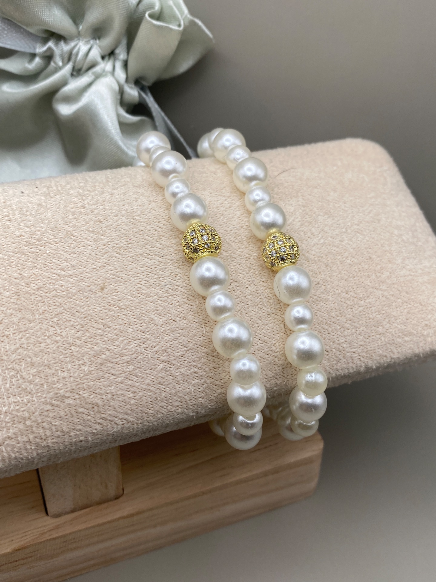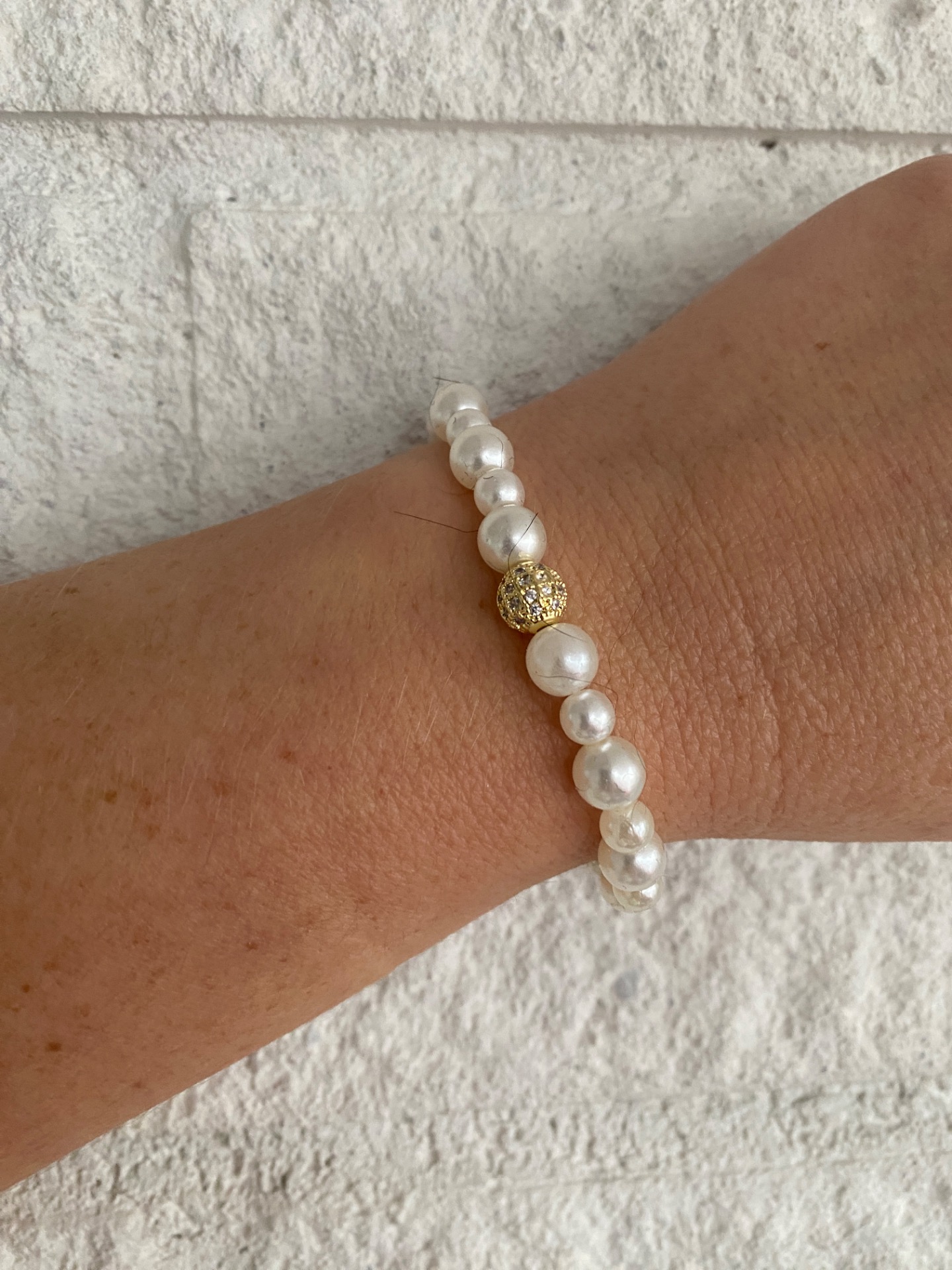 Vackert skimrande armband i varvat benvita blanka pärlor i olika storlekar och vacker guldfärgad strass i blickfånget och avslutas med min signaturpärla.