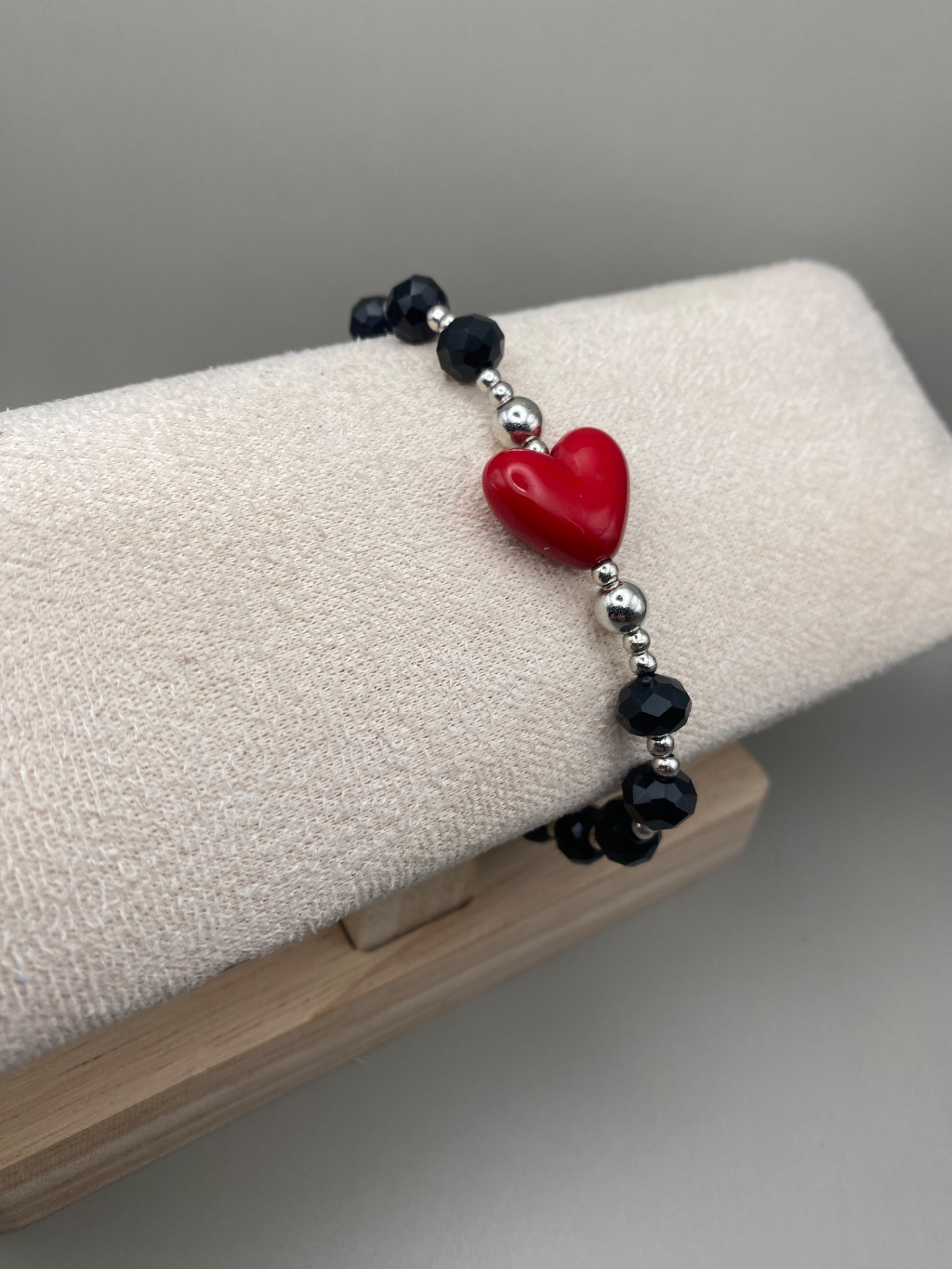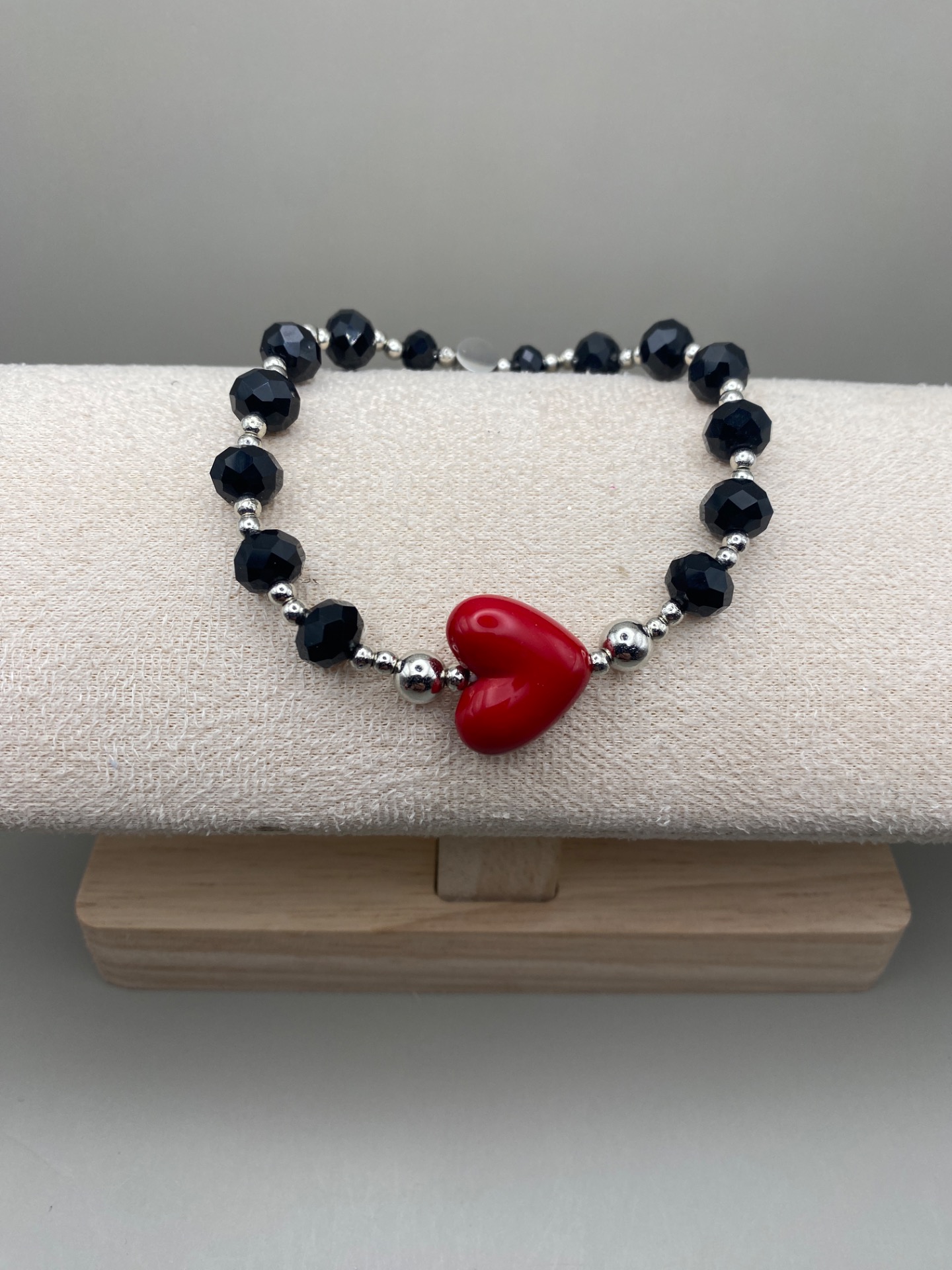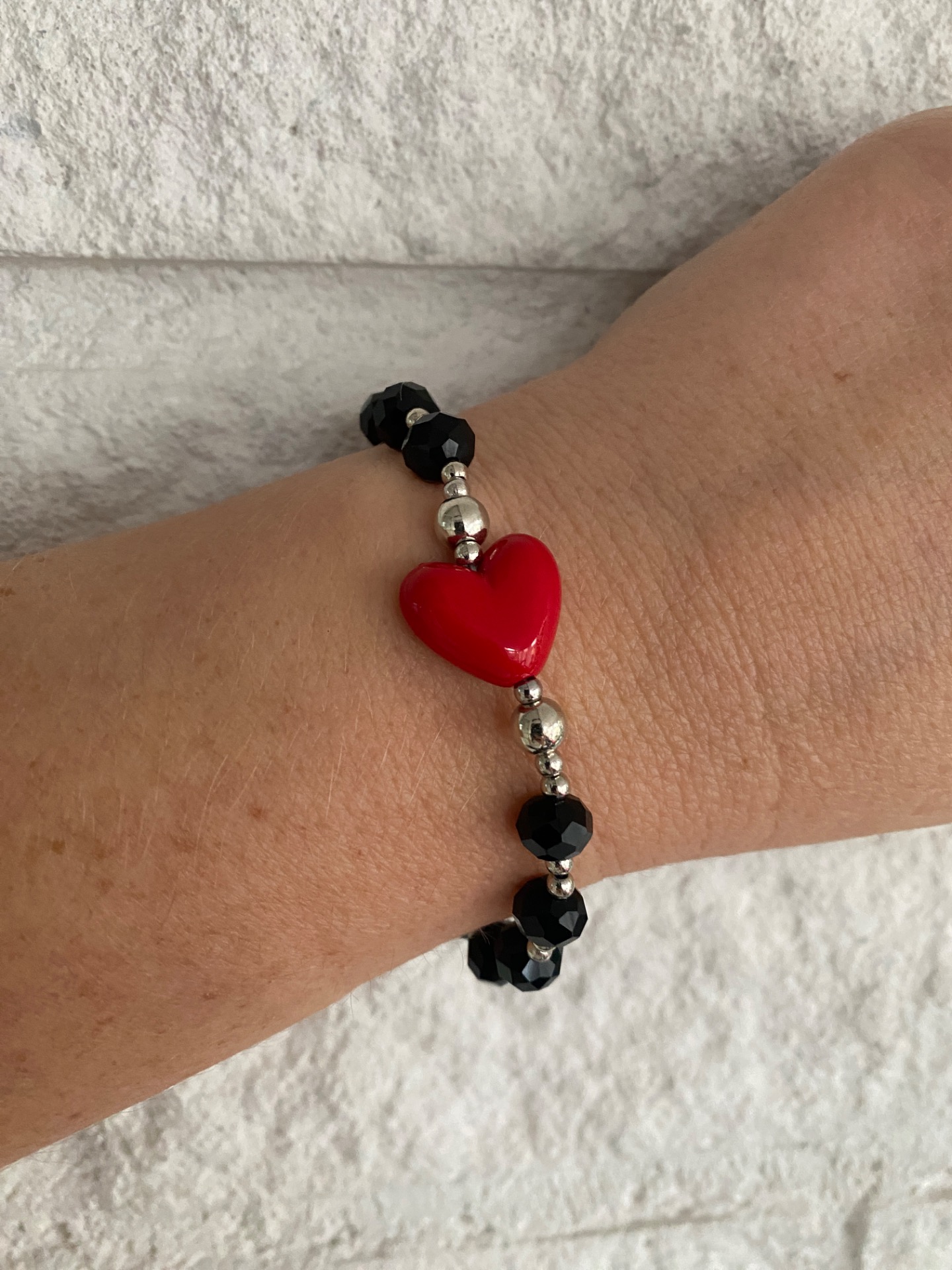 Lekfullt svart armband i varvat svarta facetterade glaskristallpärlor och silverfärgade distanser, fin detalj av ett högblankt rött hjärta i blickfånget och avslutas med min signaturpärla.