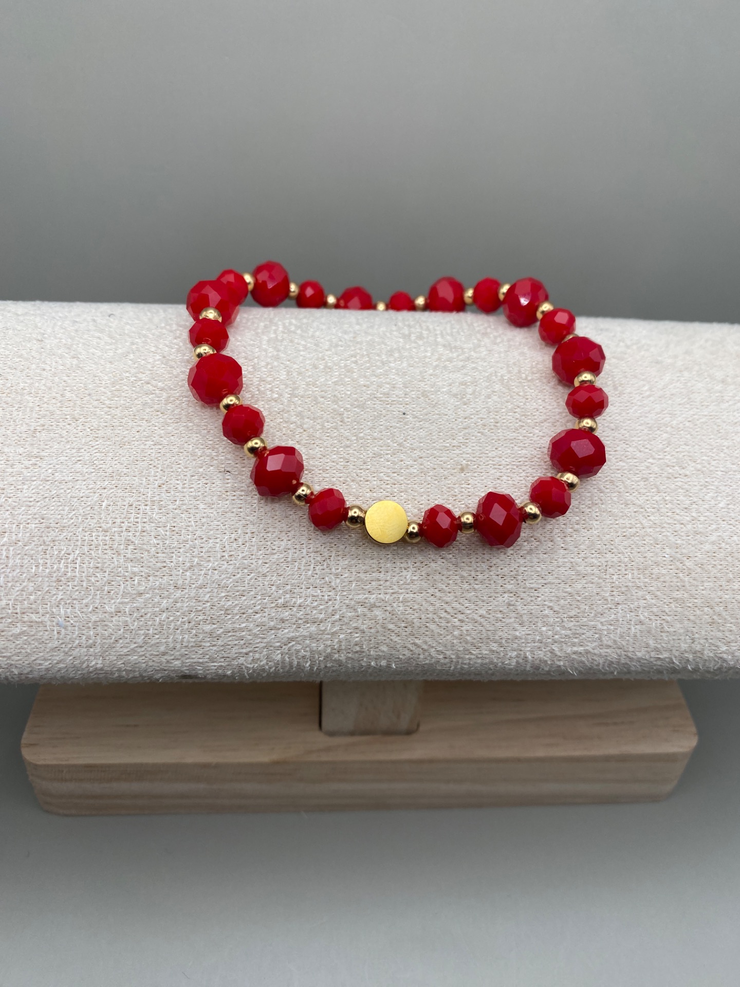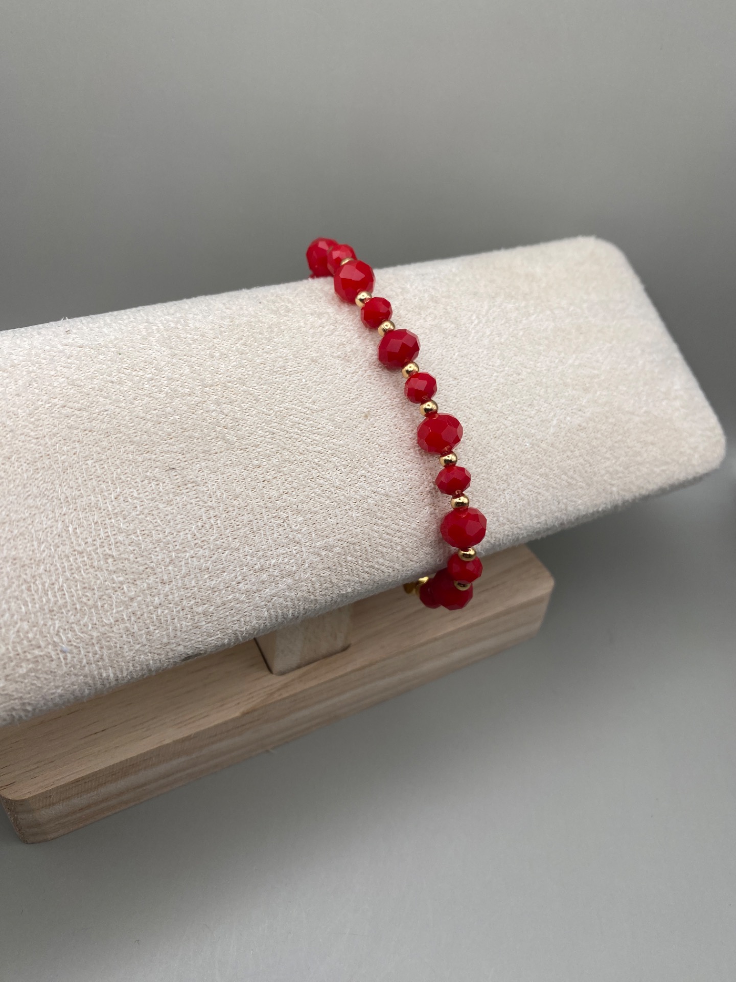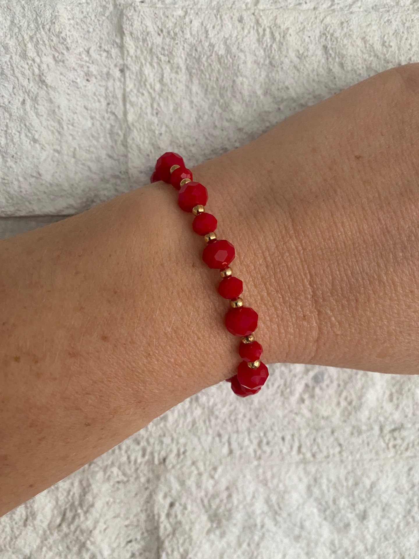 Vackert rött armband i varvat olika storlekar av röda facetterade glaskristallpärlor och guldfärgade distanser och avslutas med min signaturpärla.