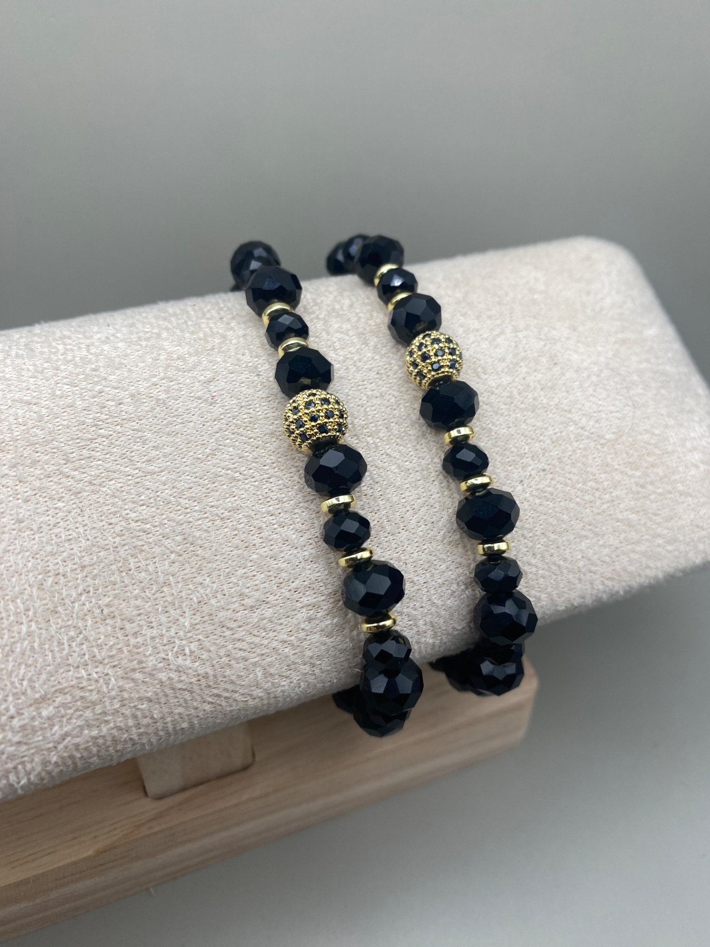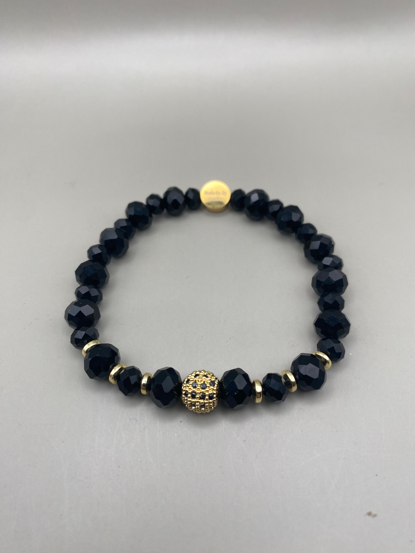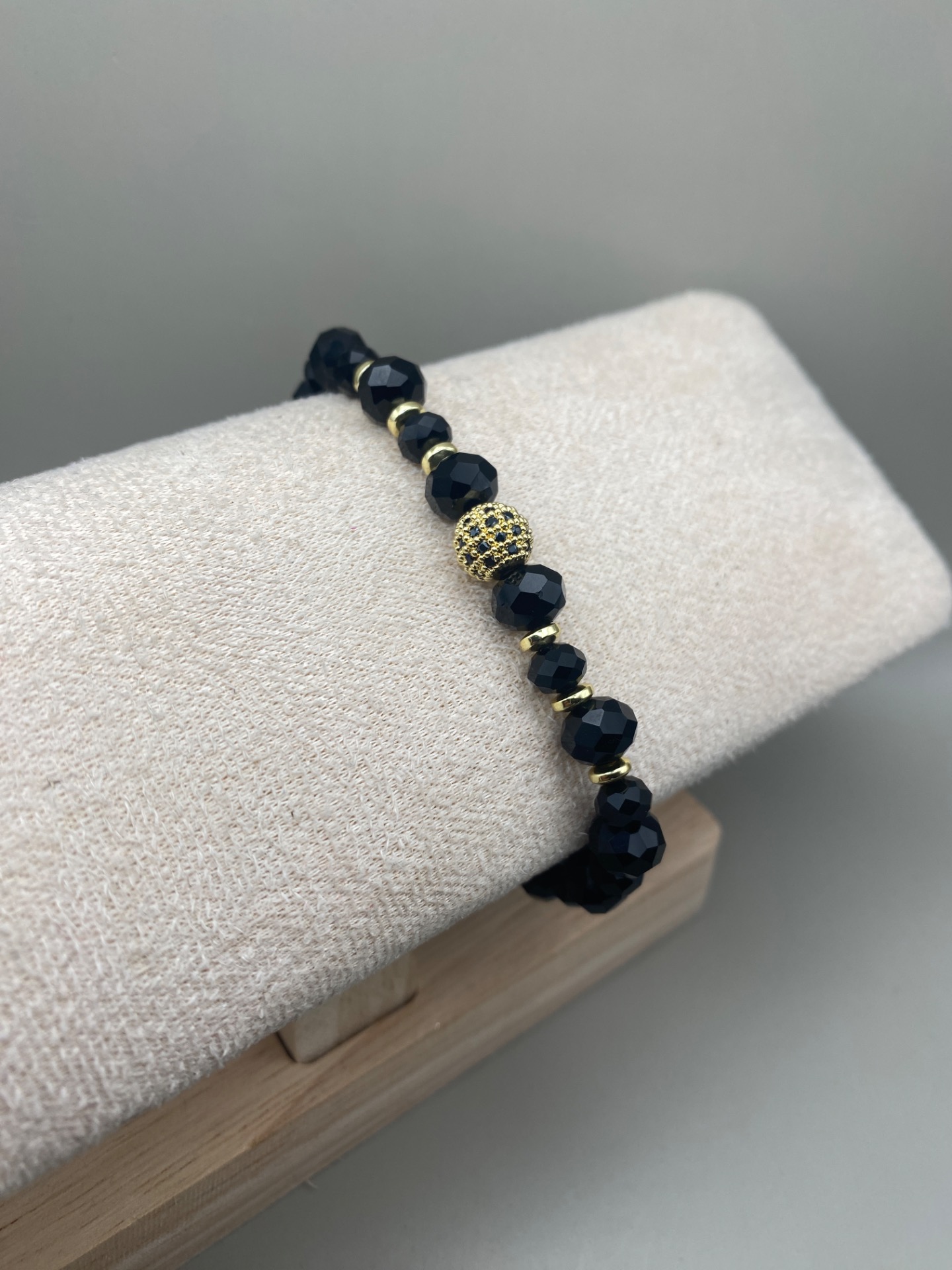 Vackert och lyxigt armband i svarta högblanka facetterade glaskristallpärlor i olika storlekar varvat med små guldfärgade pärlor och vacker guldfärgad pärla med rhinestones i blickfånget