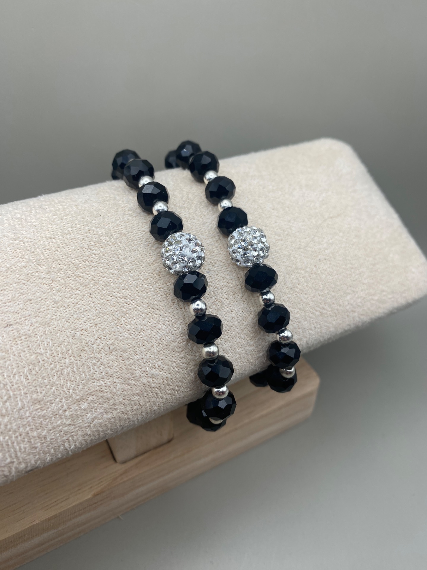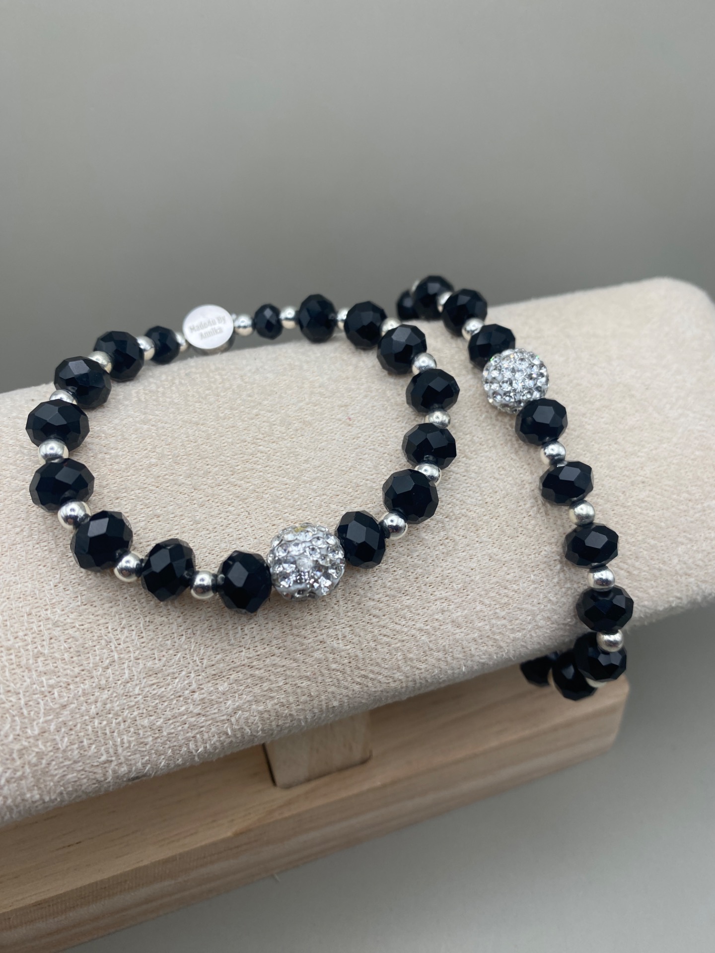 Vackert och lyxigt armband i svarta högblanka facetterade glaskristallpärlor i olika storlekar varvat med små silverfärgade pärlor och vacker silverfärgad pärla med rhinestones i blickfånget