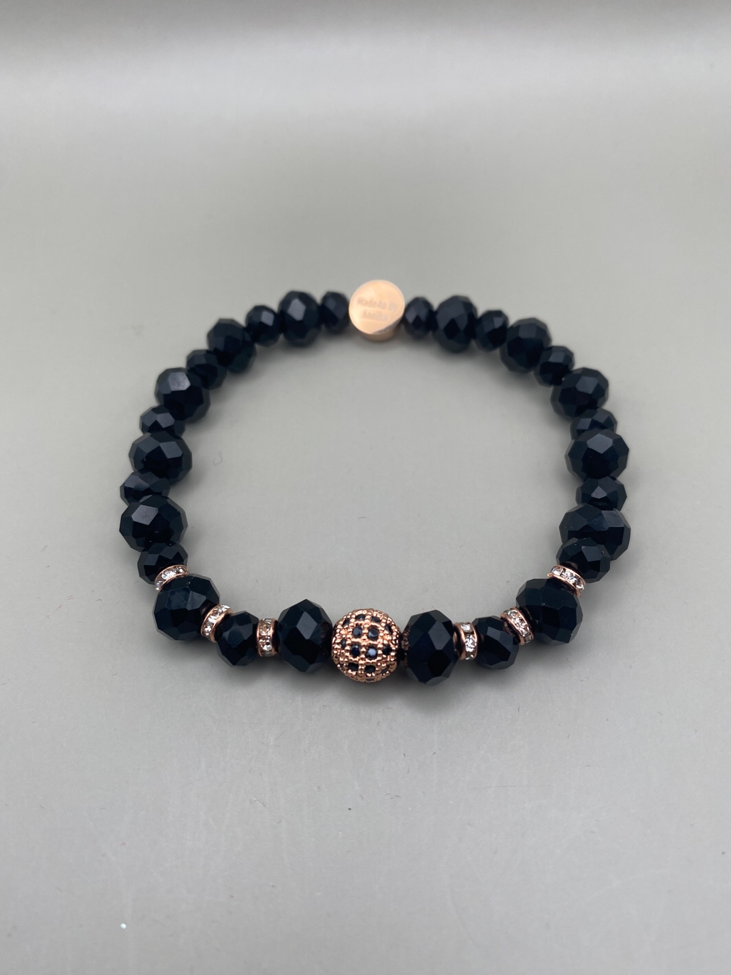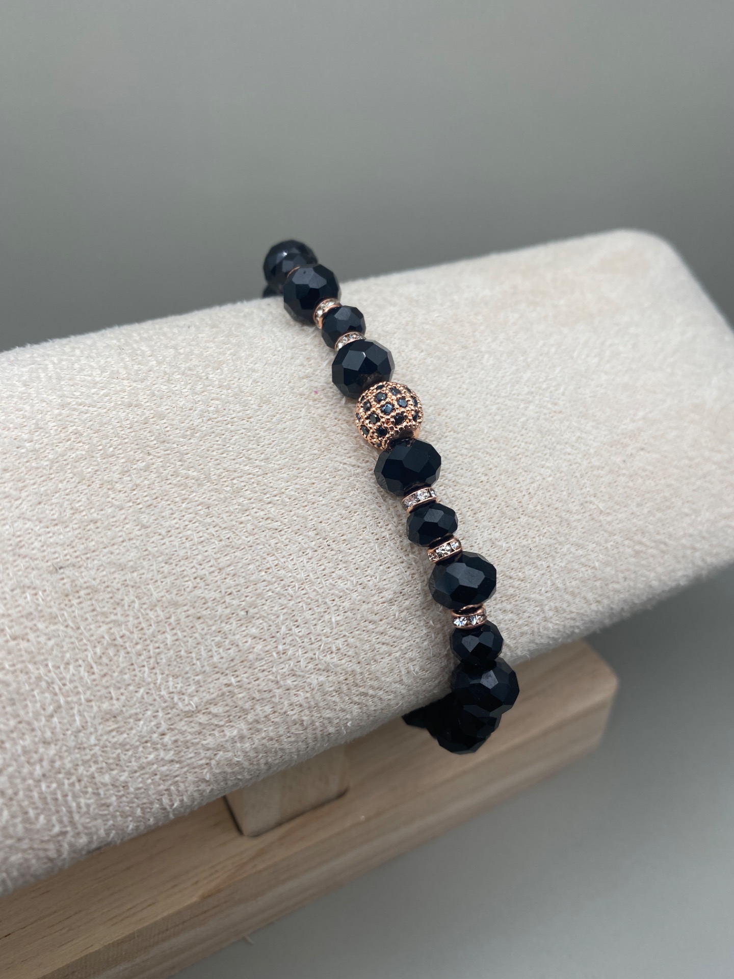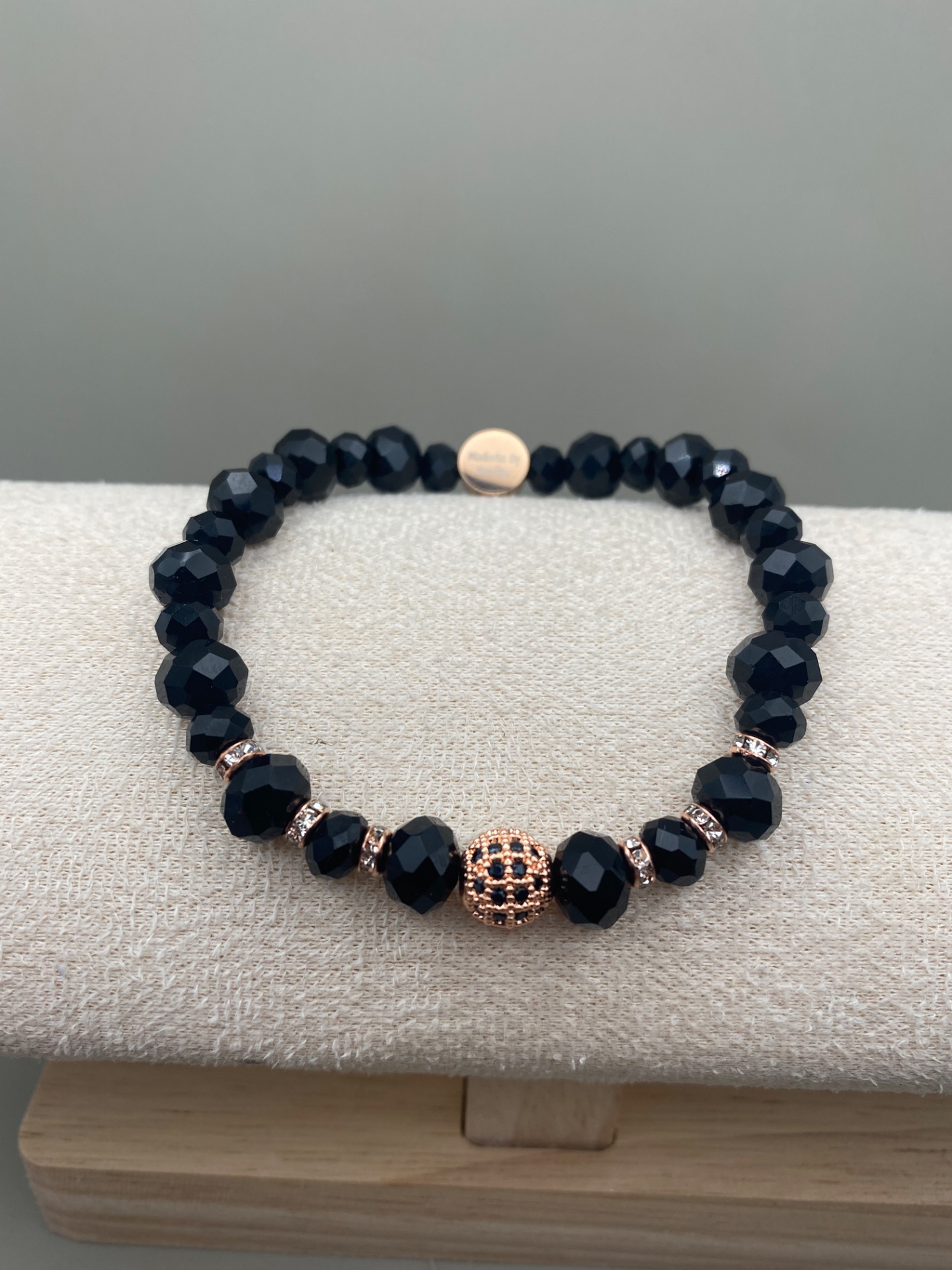 Vackert och lyxigt armband i svarta högblanka facetterade glaskristallpärlor i olika storlekar varvat med små roséfärgad strass och vacker roséfärgad pärla med rhinestones i blickfånget