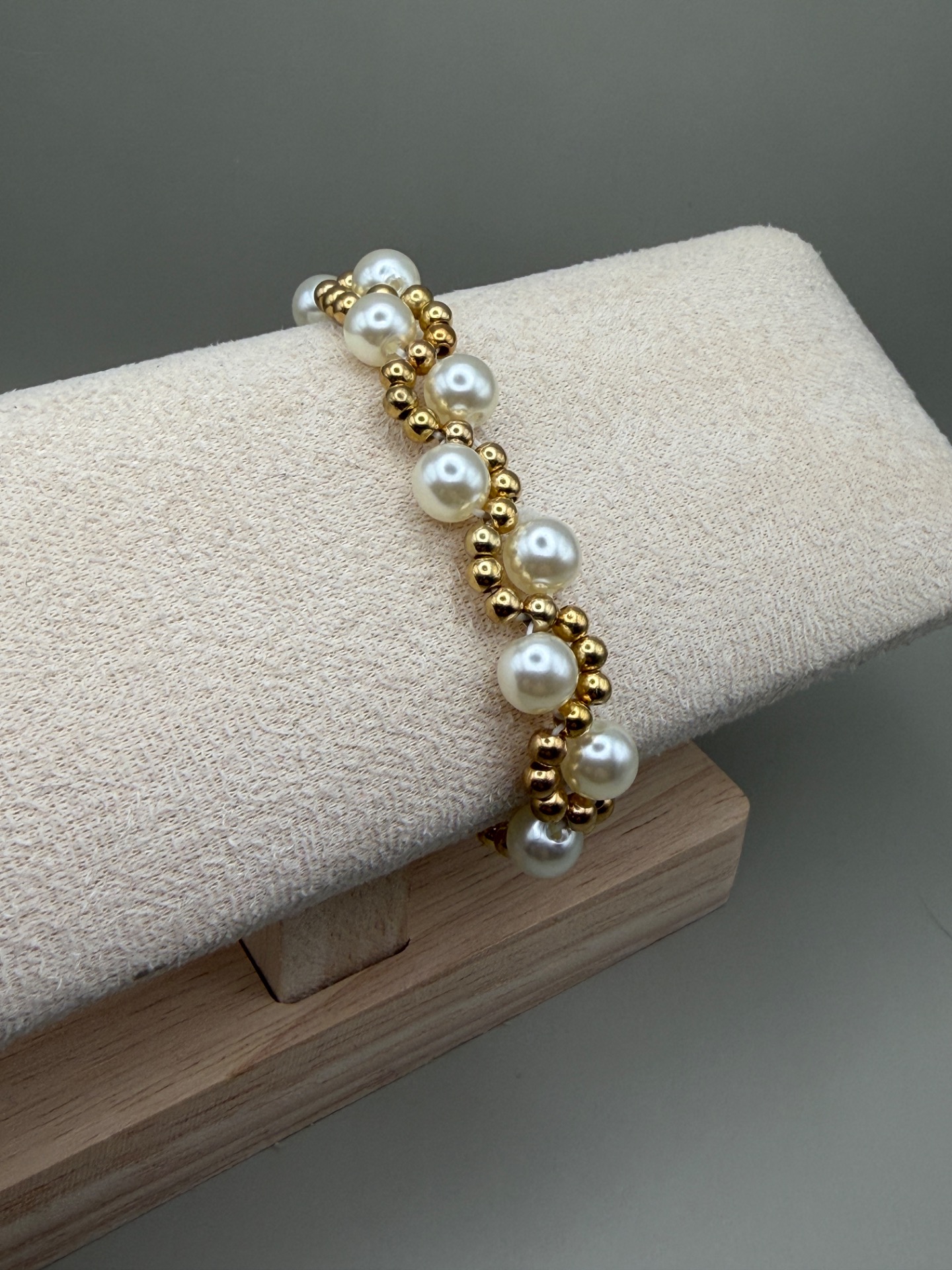 Vackert stilrent armband i varvat mönster av benvita glansiga pärlor och små guldfärgade pärlor.
