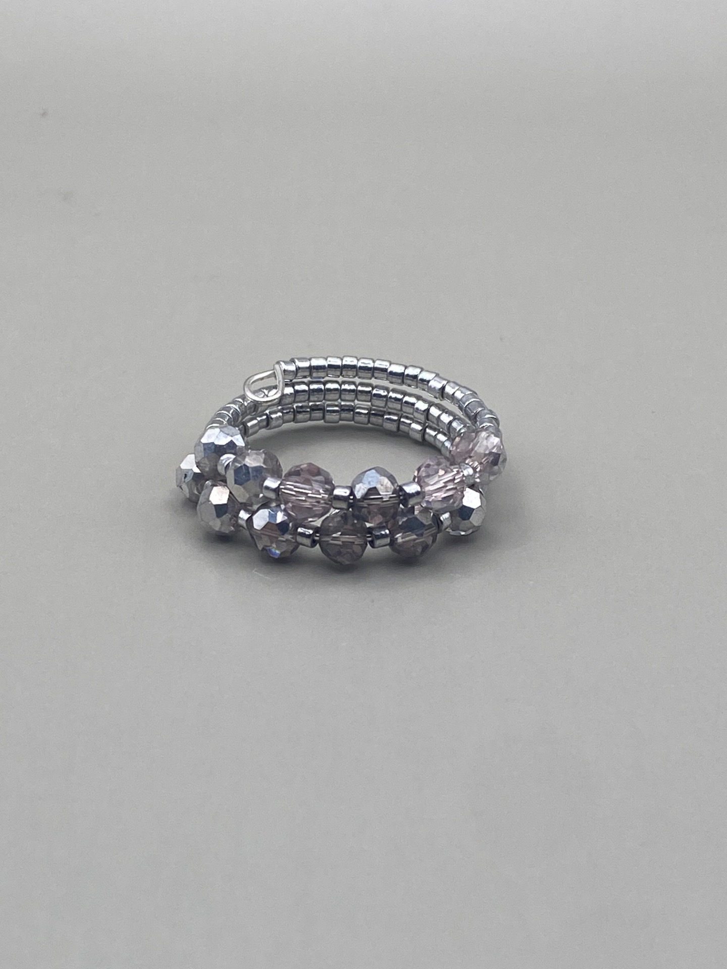 Glimmande ring i tvåradigt mönster av små silverfärgade glaspärlor runt om och i blickfånget och två rader med varvat spegelblanka silvriga glaskristallpärlor varvat med silver och rosamellerade glaskristallpärlor. Superfin, glittrande.