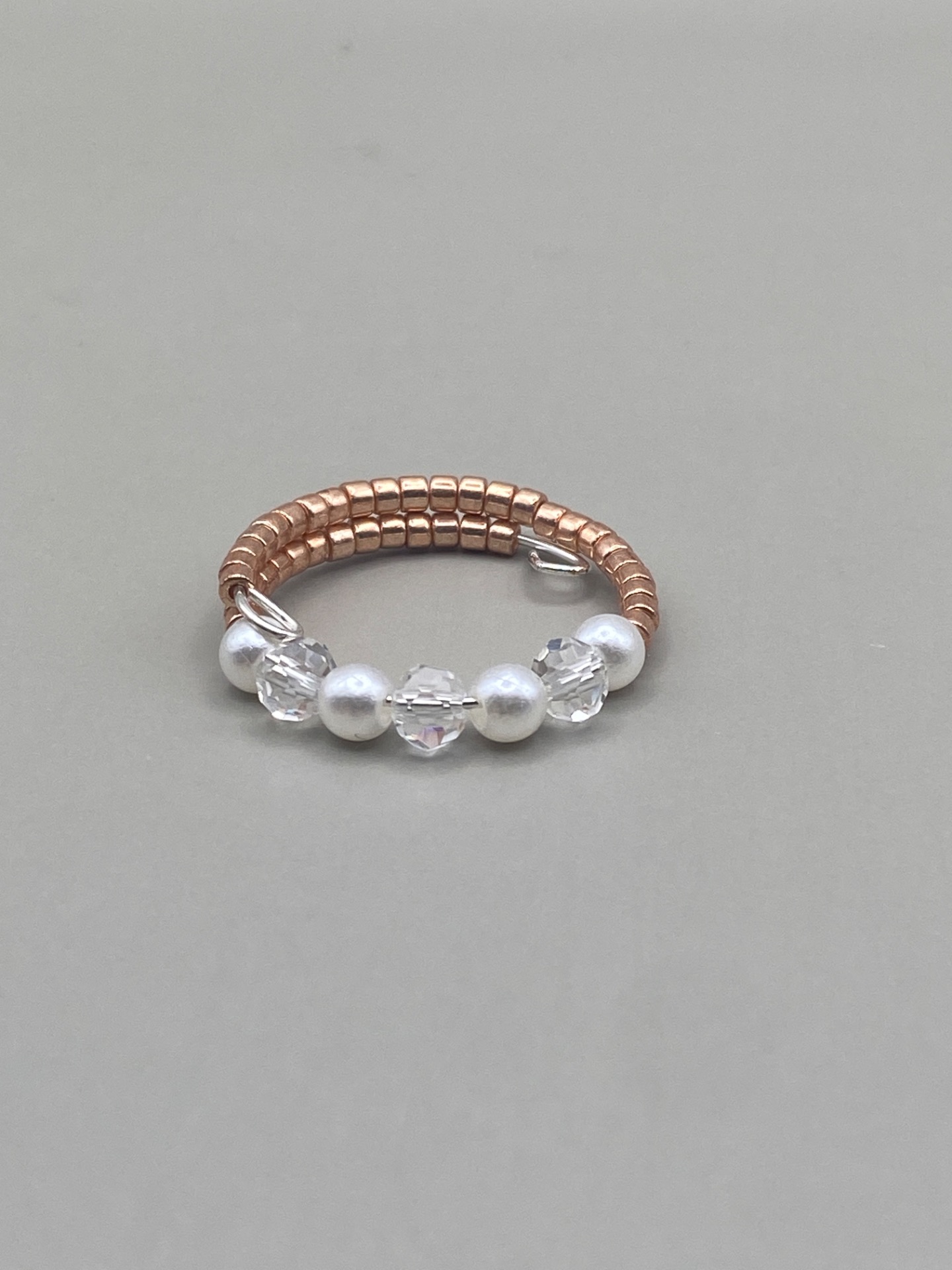 Söt ring i enradigt mönster av små roséfärgade glaspärlor runt om och i blickfånget en rad med varvatvita små runda pärlor och klara facetterade glaskristallpärlor. Superfin, stilren.