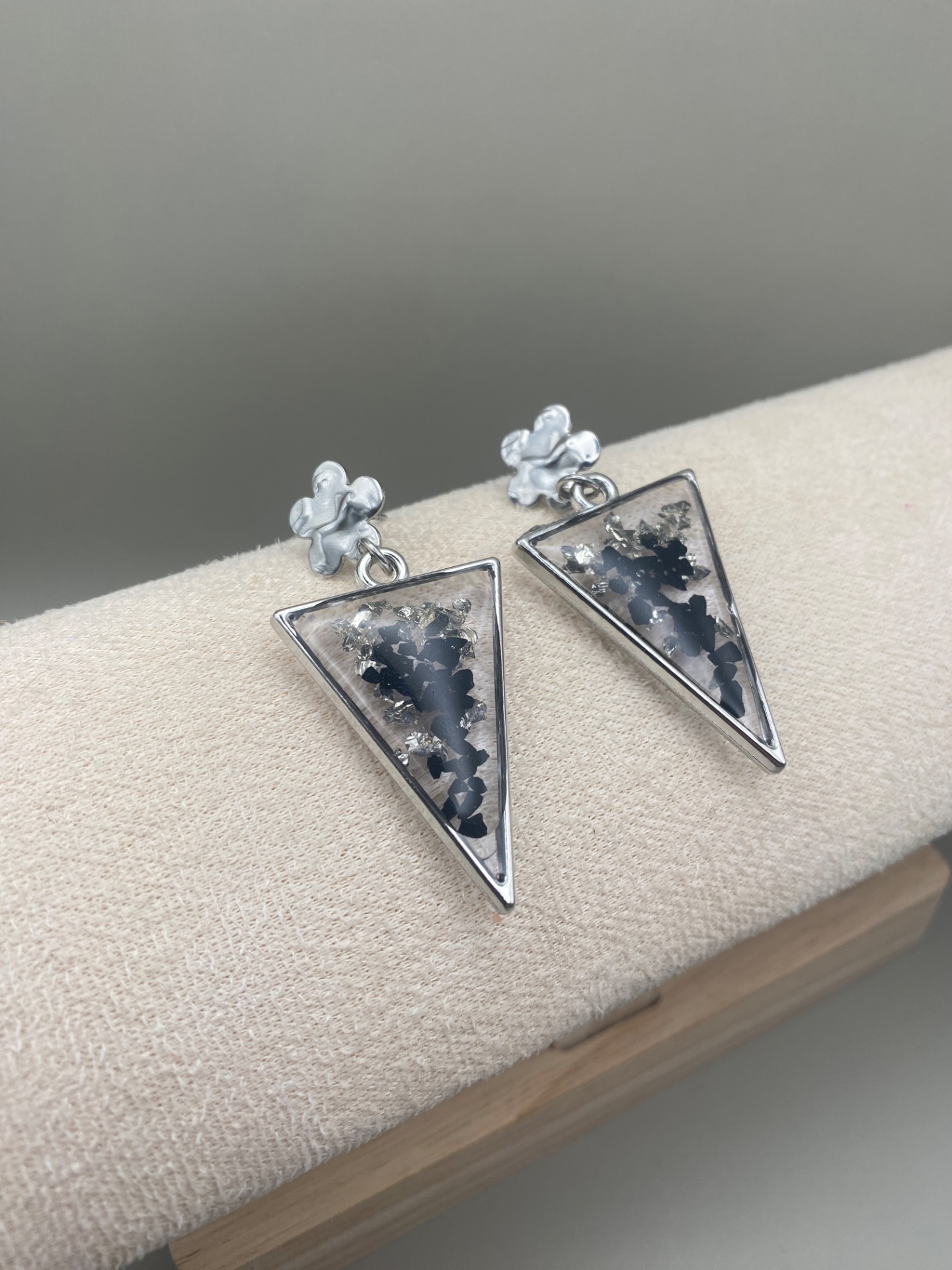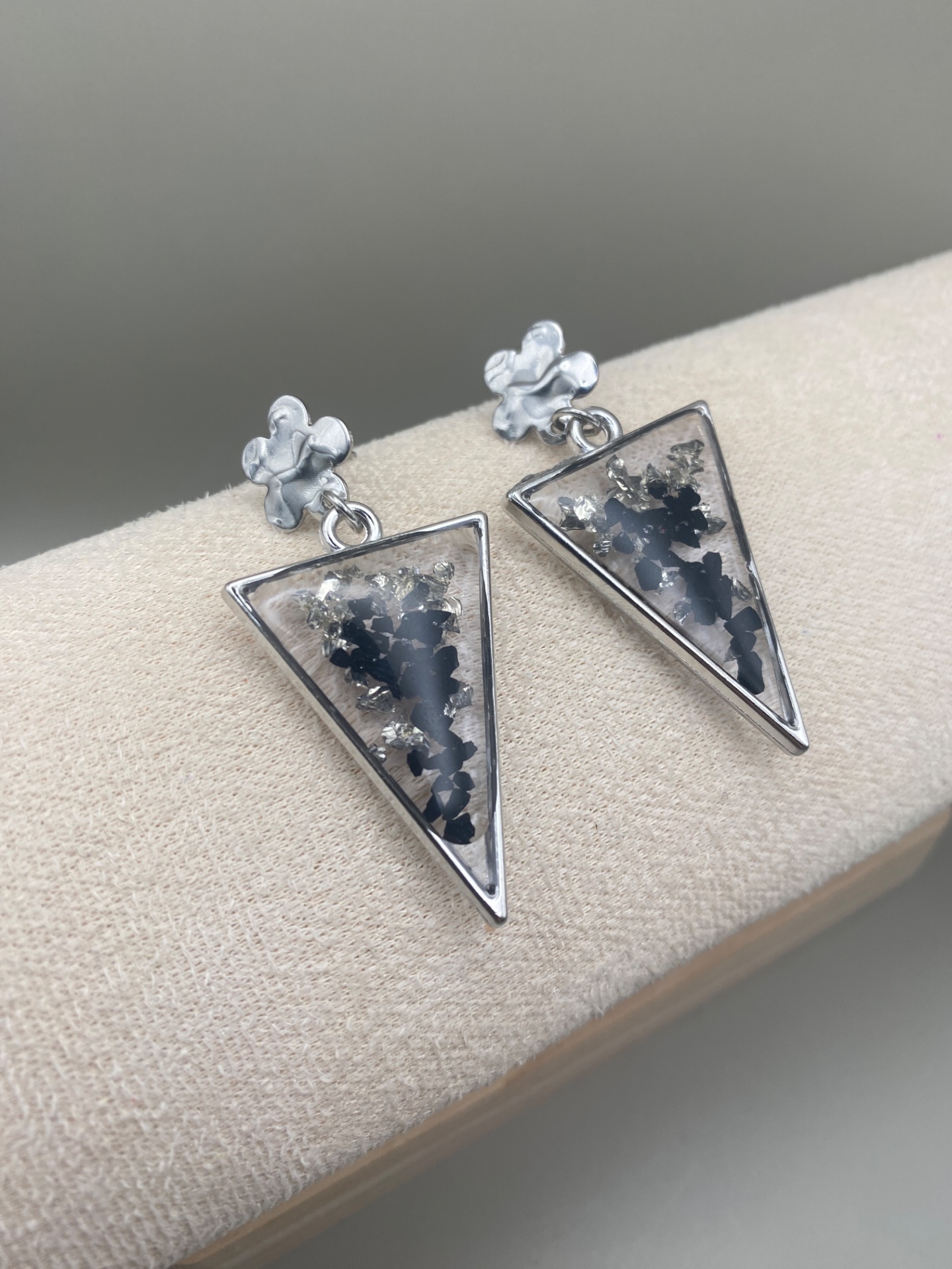 Stiliga men lekfulla örhängen i silverfärg, formade som blommor. Det trekantiga hänget i klar, glansig resin påminner om glas och skimrar vackert med svarta och silverfärgade glitterdetaljer.