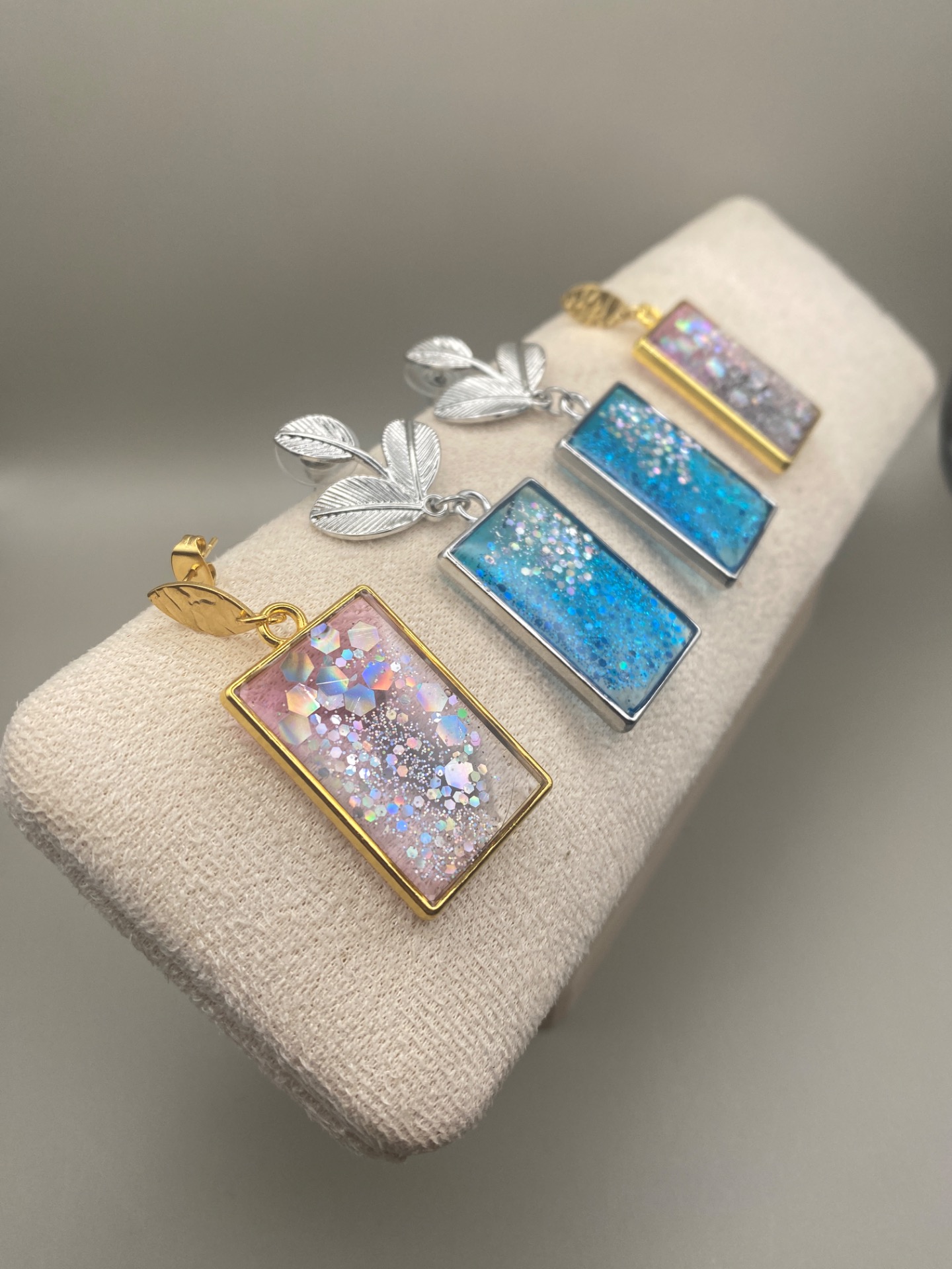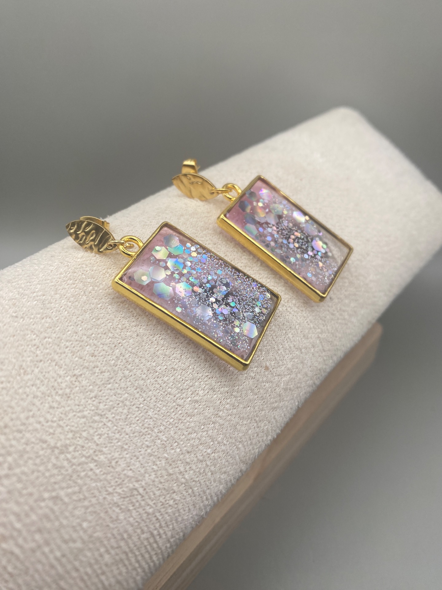 Stiliga men lekfulla örhängen i guldfärg, formad i oval knackad form. Det rektangulära hänget i klar och aningen rosa, glansig resin påminner om glas och skimrar vackert med silverfärgade glitterdetaljer inuti.