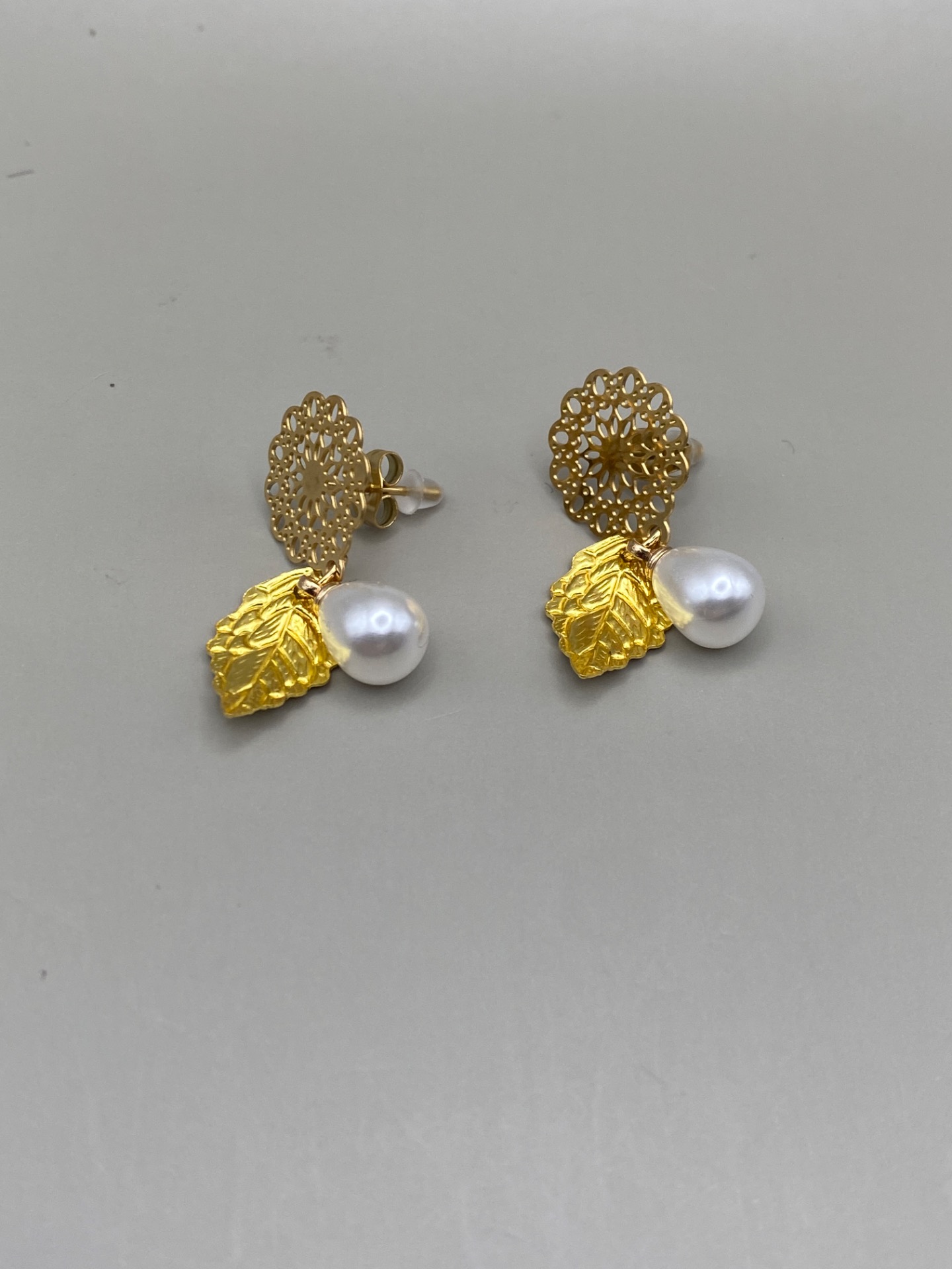 Söta örhängen med guldfärgad mönstrat stift med ett hängande löv och vit pärla.