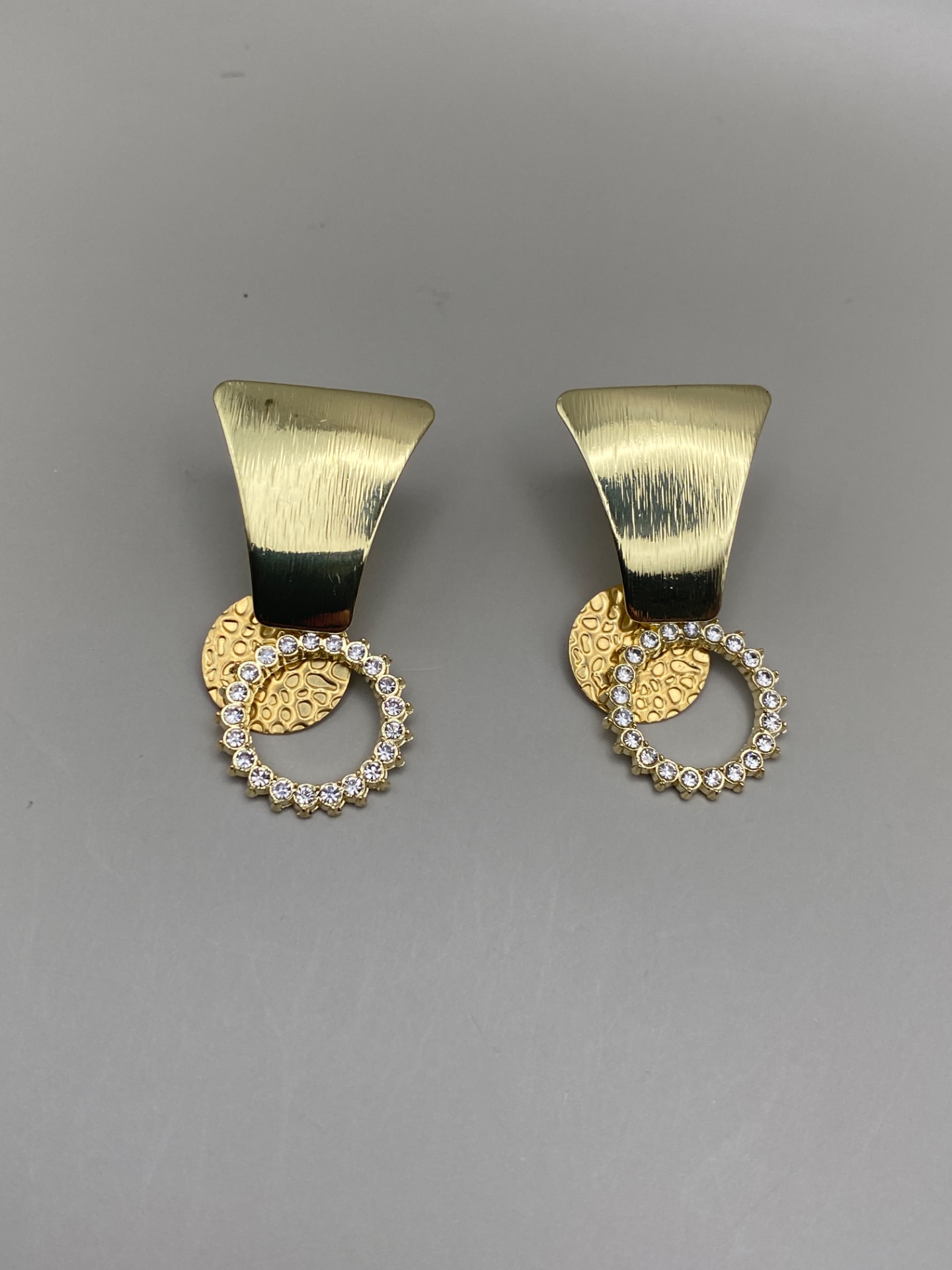 Festliga och dekorativa örhängen med stort guldfärgat stift och vacker hängande rund berlock med strass och en knackad bricka