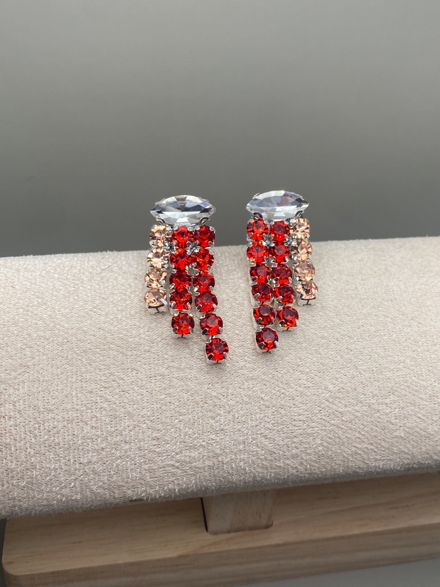 Lekfulla strassörhängen med två rader röda större strass, en rad rosefärgad accent och en liggande oval klar strass.