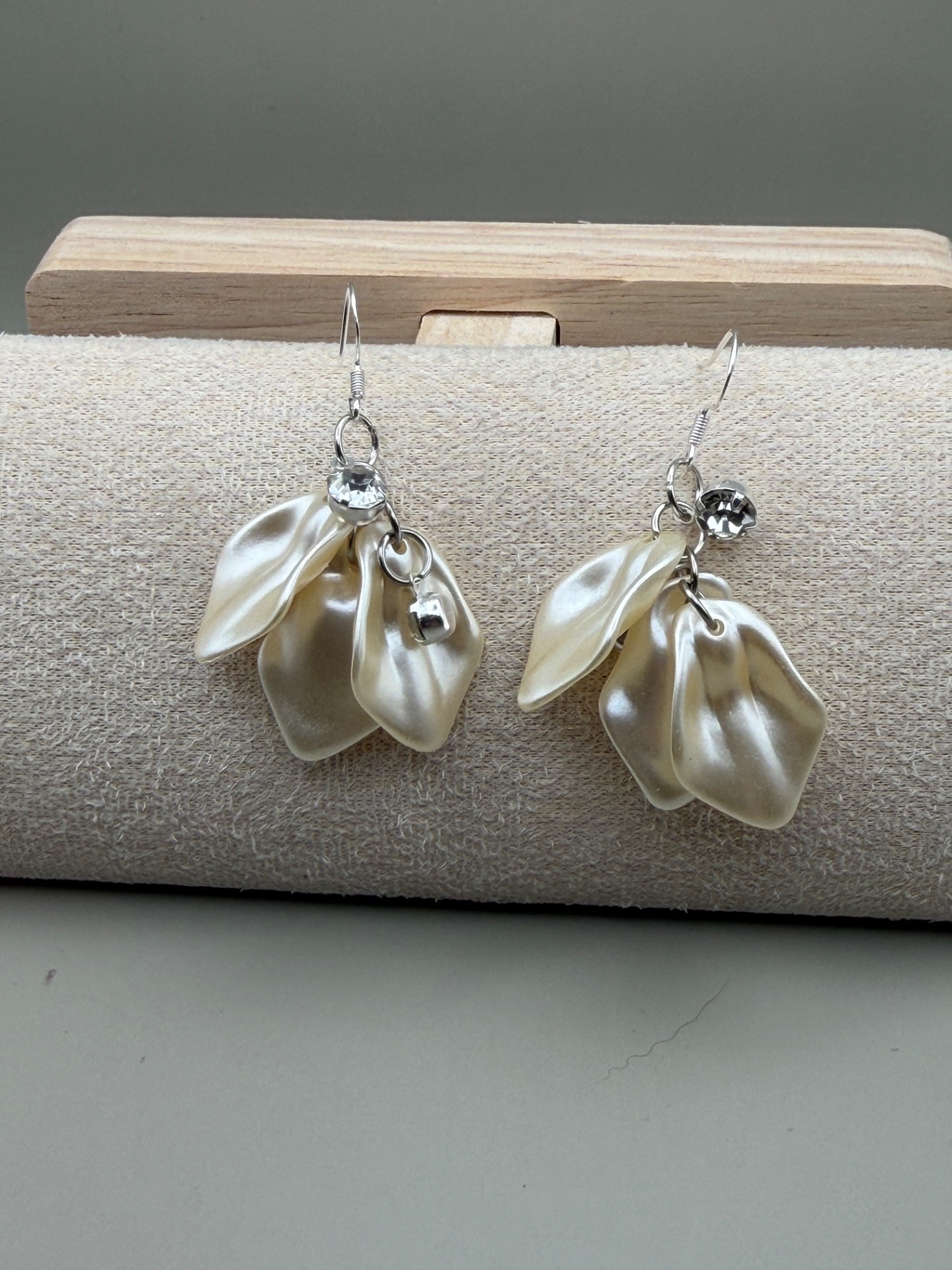 Vackra dinglande örhängen med tre hängande elfenbensvita löv och två cubic zirconia stenar.