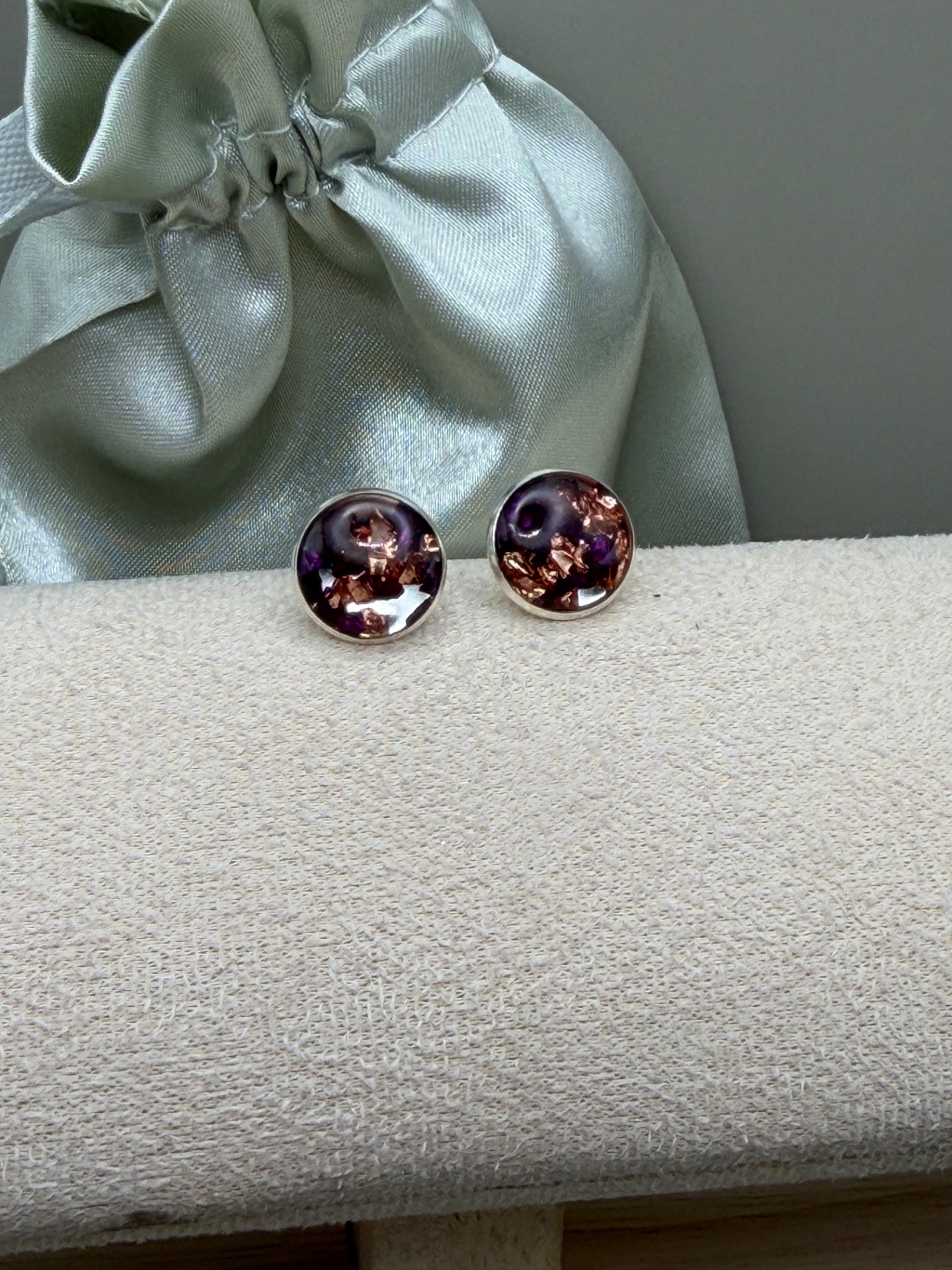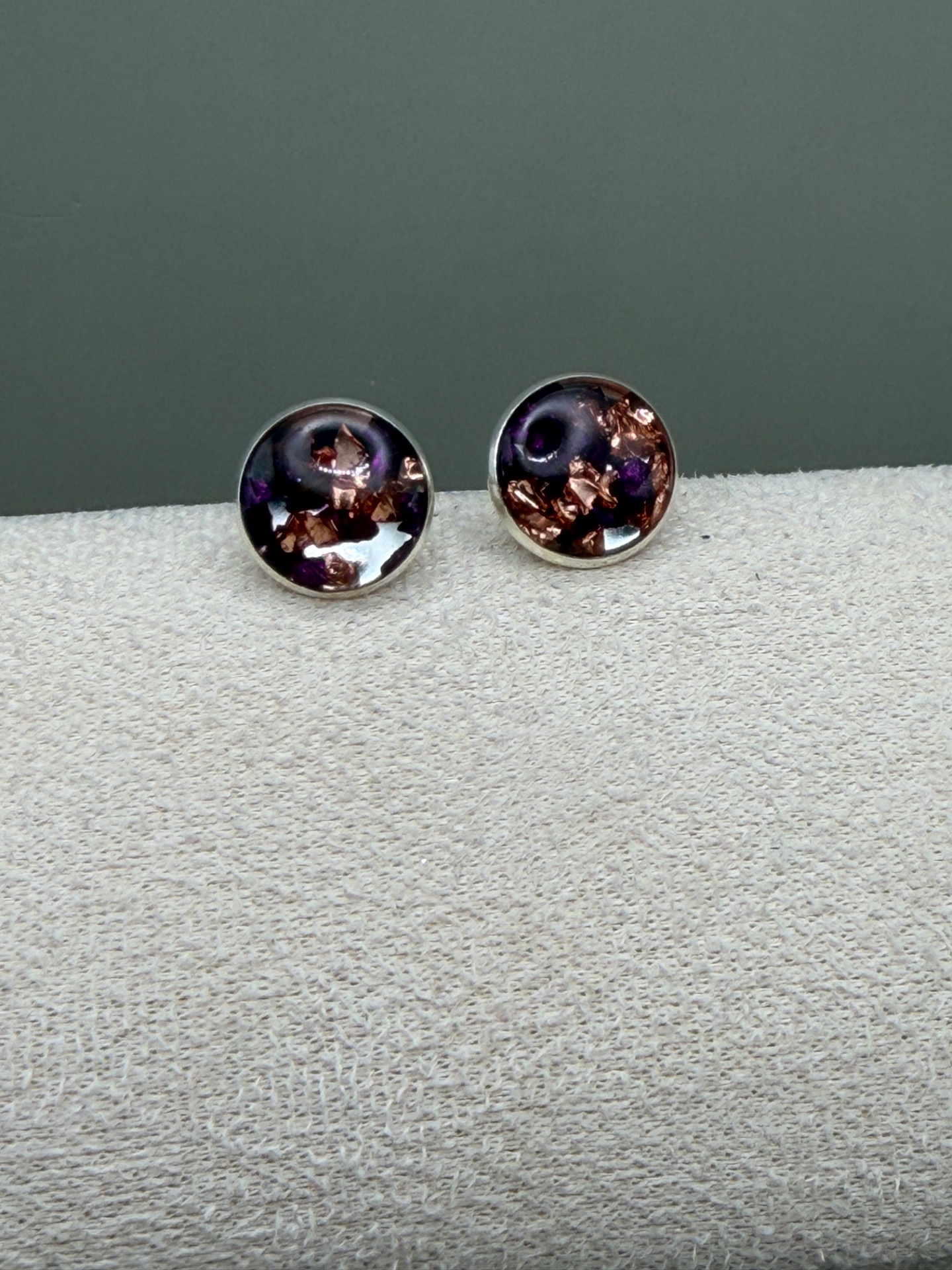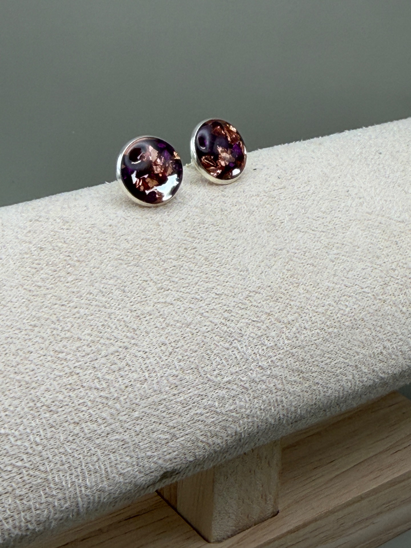 Vackra runda silverfärgade stiftörhängen i toner av lila, vinrött och svart glaskross, lagd i kristallklar resin, gjuten för hand för att ge en unik och exklusiv finish.