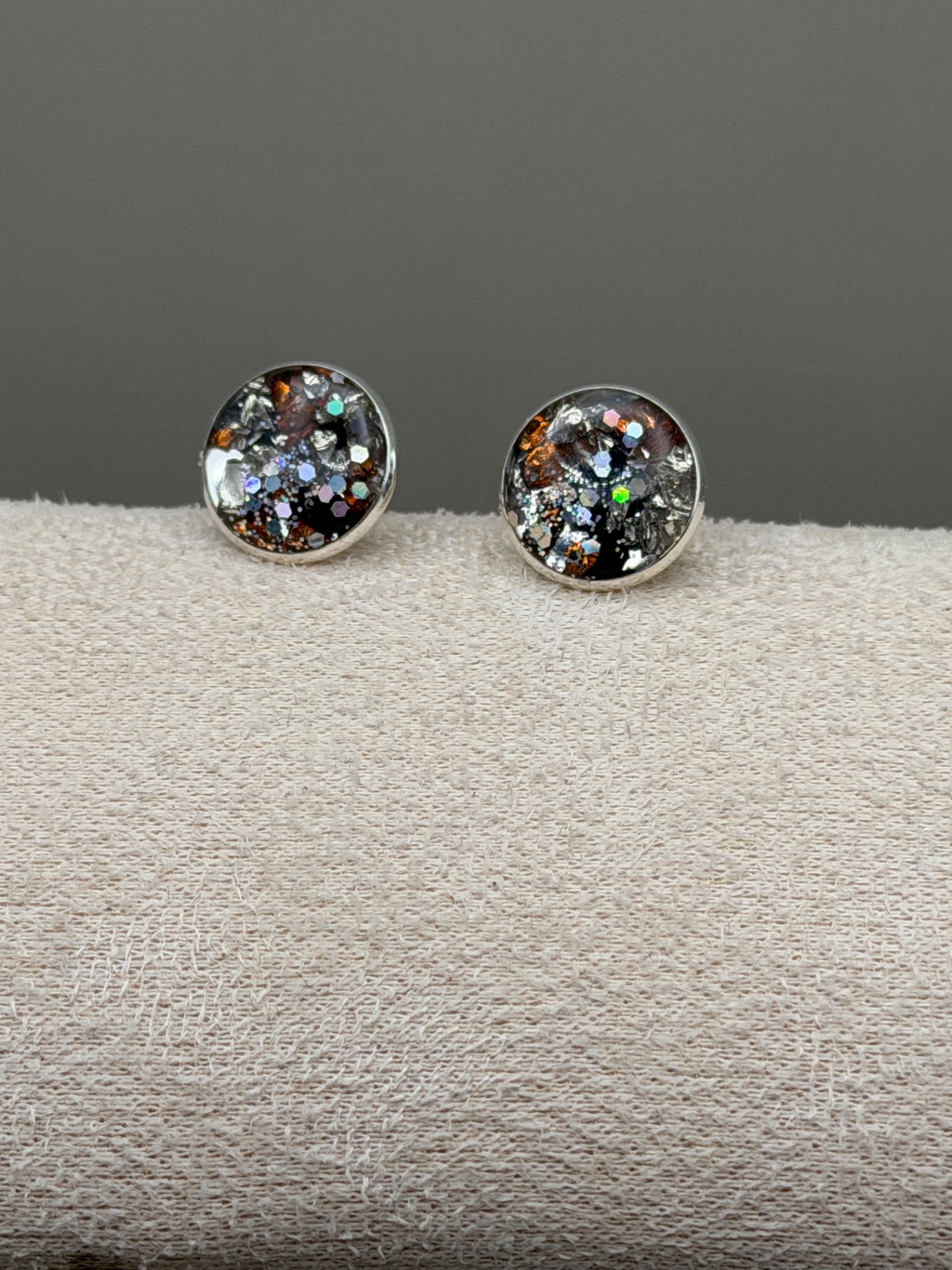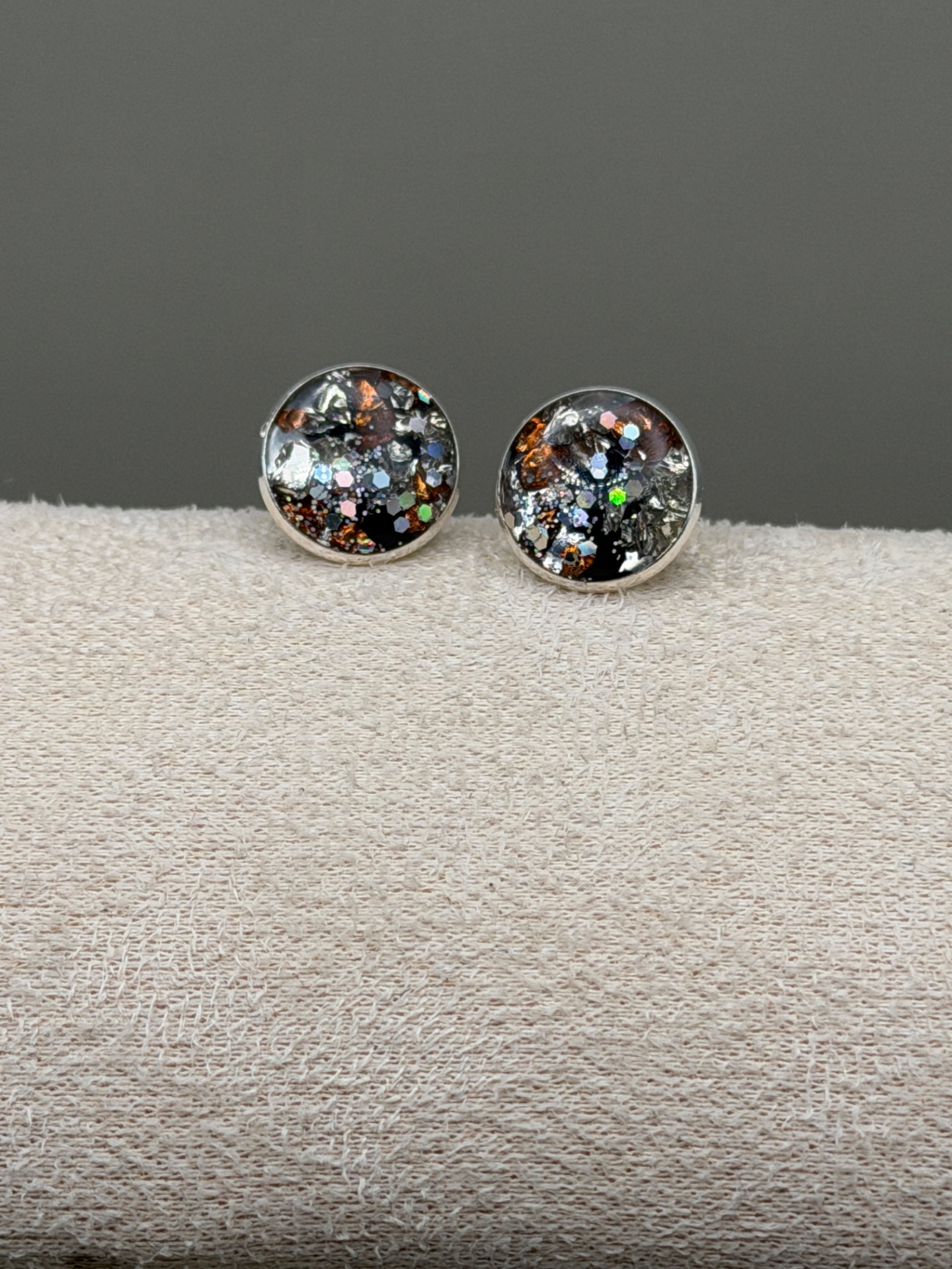 Vackra runda silverfärgade stiftörhängen i nyanser av silver, rost och svart glaskross, lagd i kristallklar resin, gjuten för hand för att ge en unik och exklusiv finish.