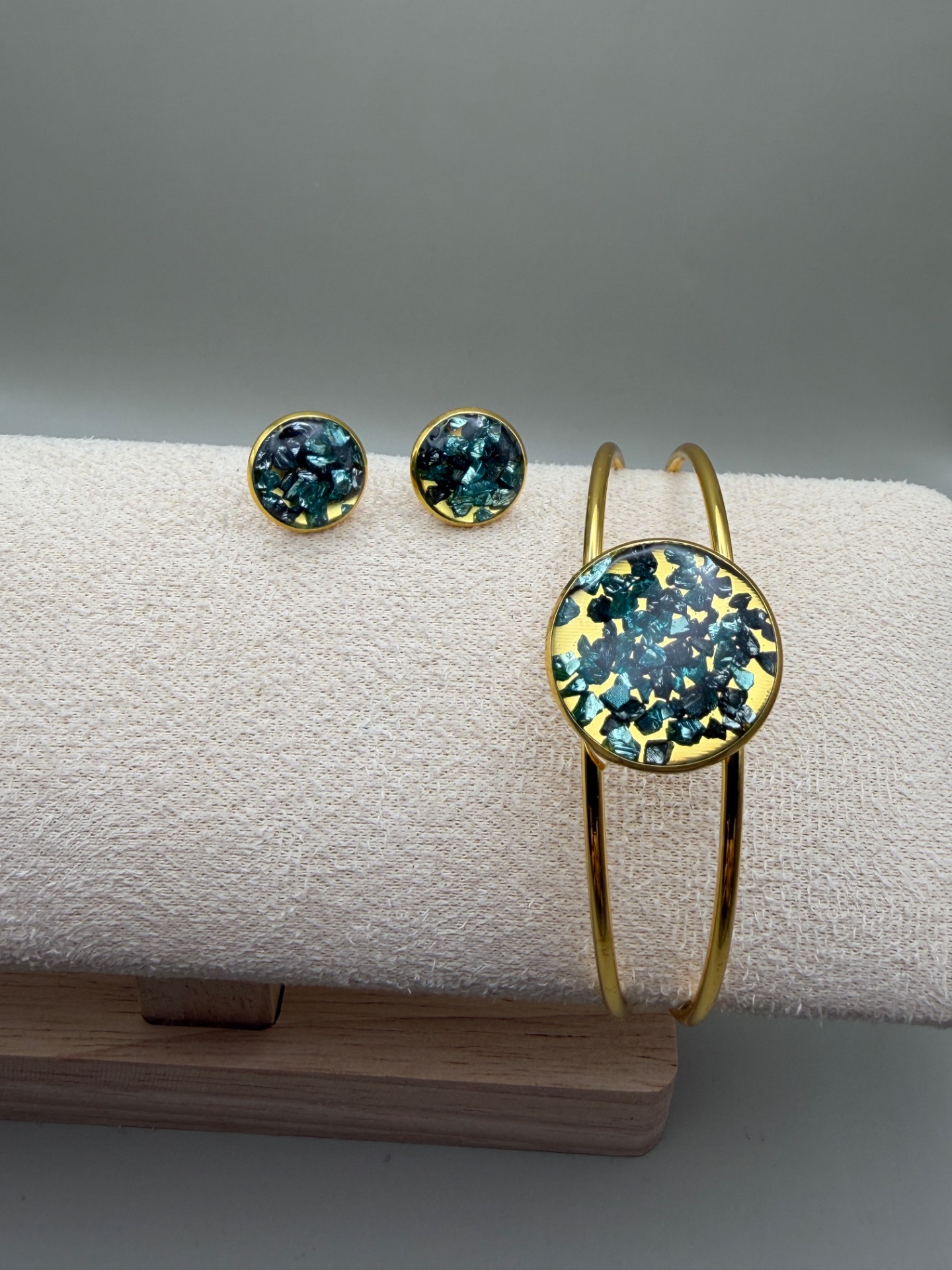Vackra runda guldfärgade stiftörhängen i nyanser av turkost och grågrönt glaskross, lagd i kristallklar resin, gjuten för hand för att ge en unik och exklusiv finish.