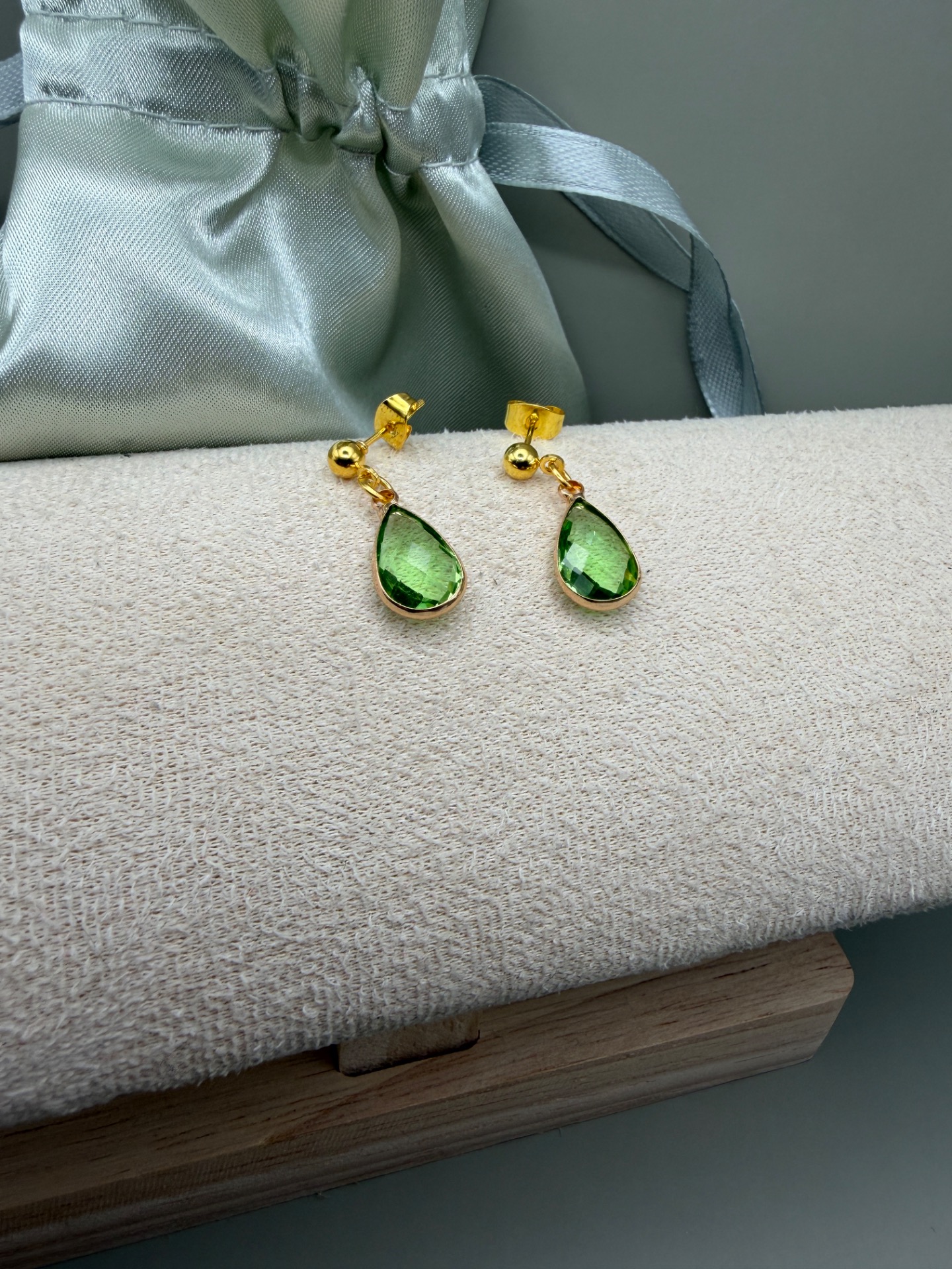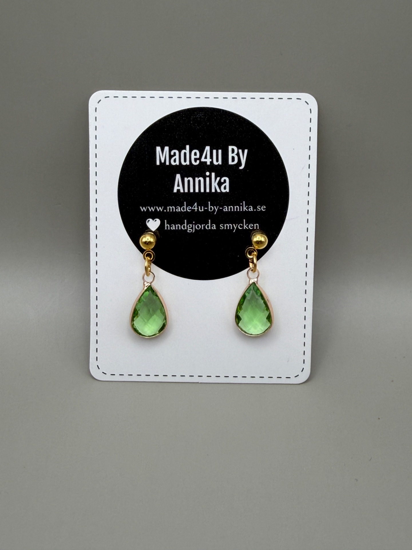 Vackra, nätta guldörhängen med vacker grön droppformad berlock i glas.