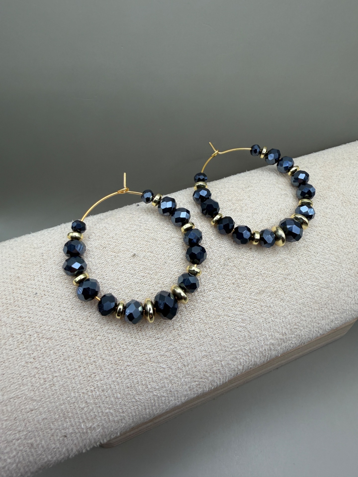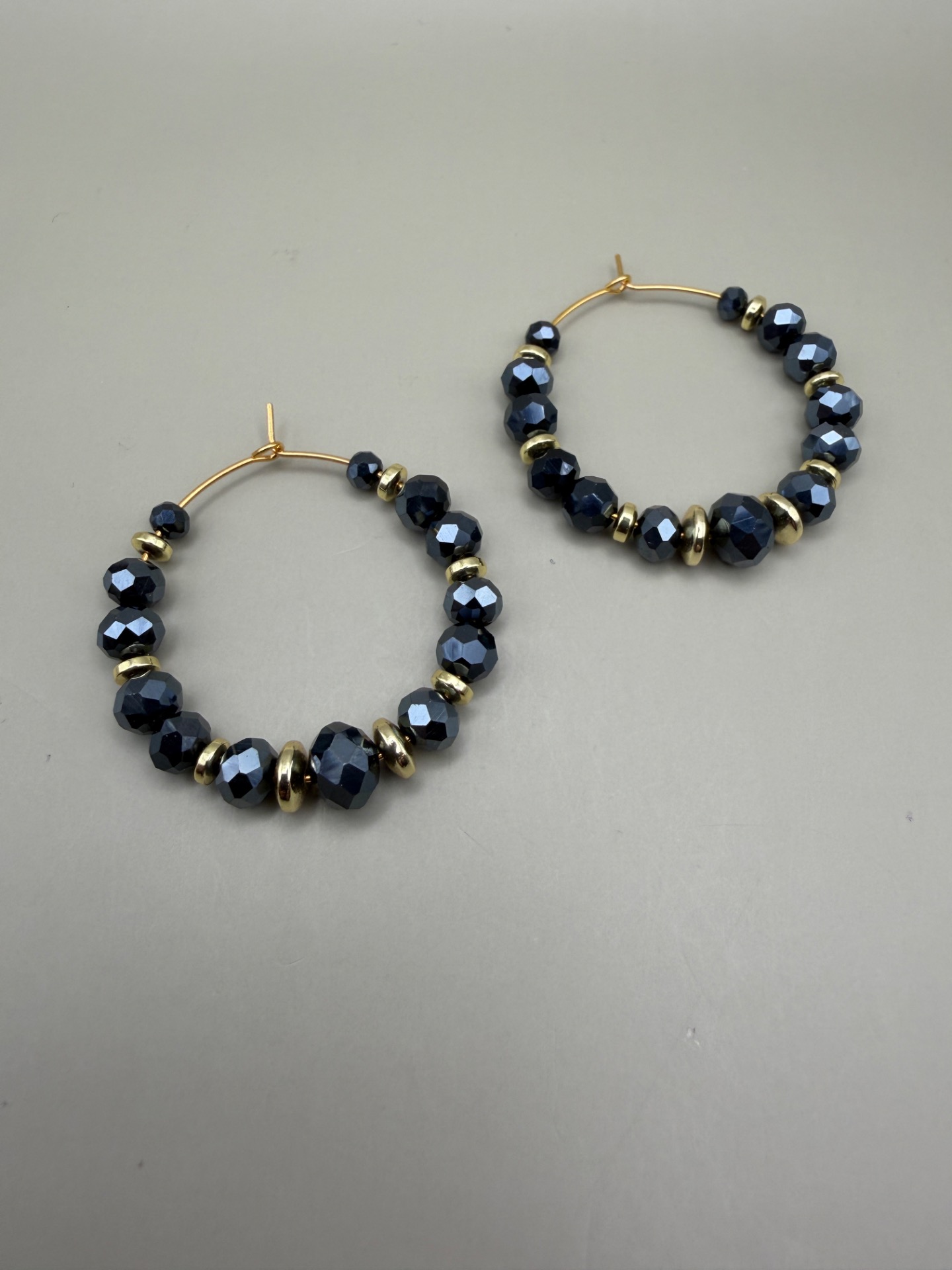 Vackra stora creolörhängen med varvat mönster av midnattsblå spegelblanka glaskristallpärlor i olika storlekar och guldfärgade hematitpärlor.
