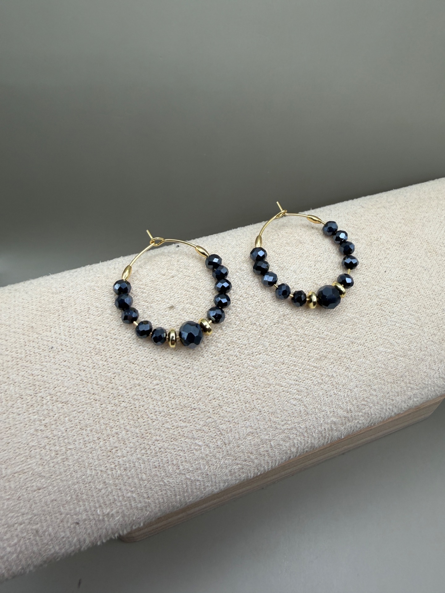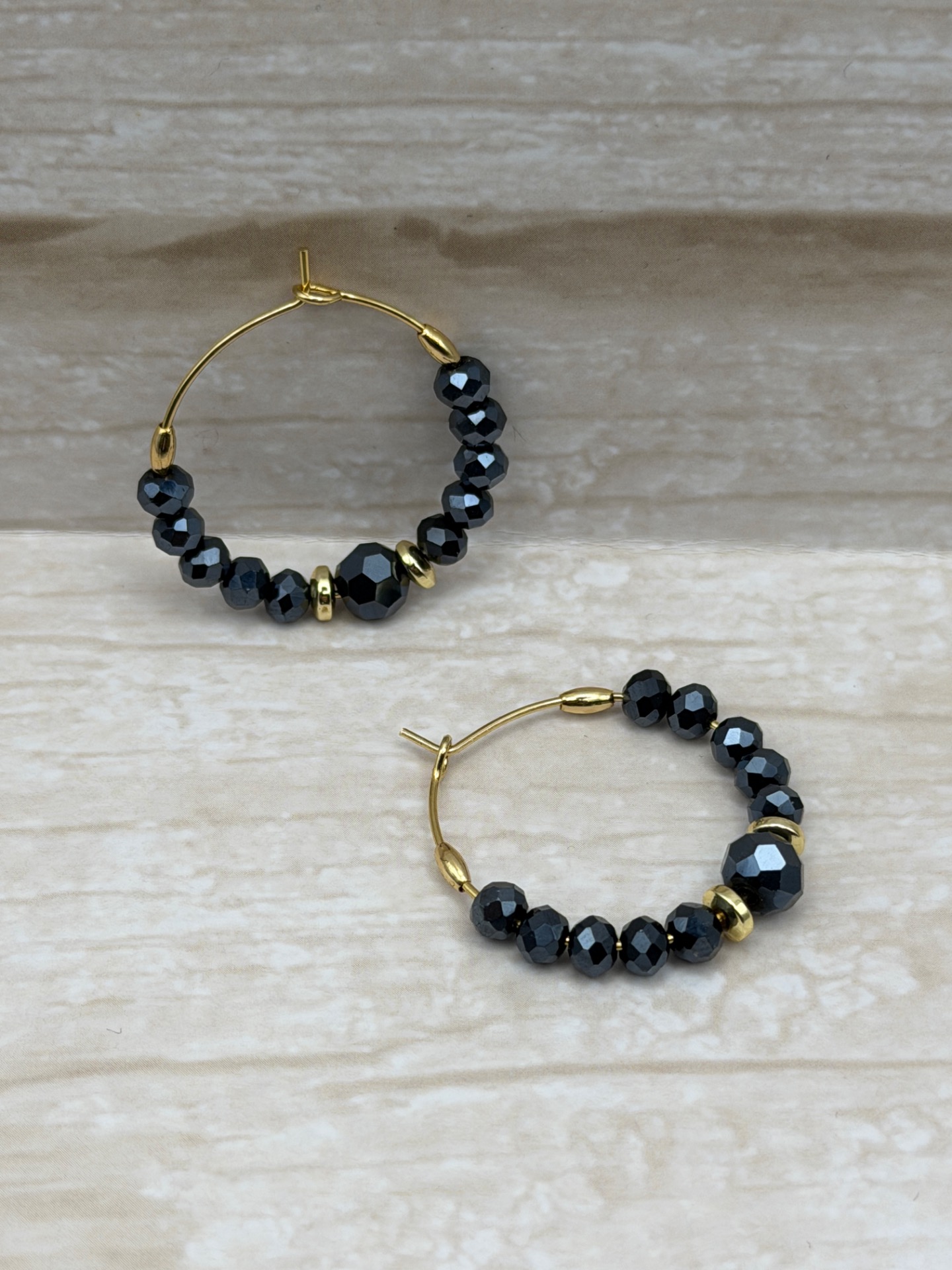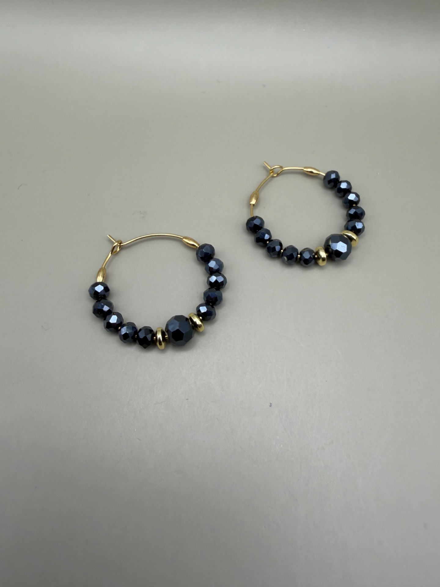 Vackra stora creolörhängen med varvat mönster av små midnattsblå spegelblanka glaskristallpärlor och guldfärgade hematitpärlor.