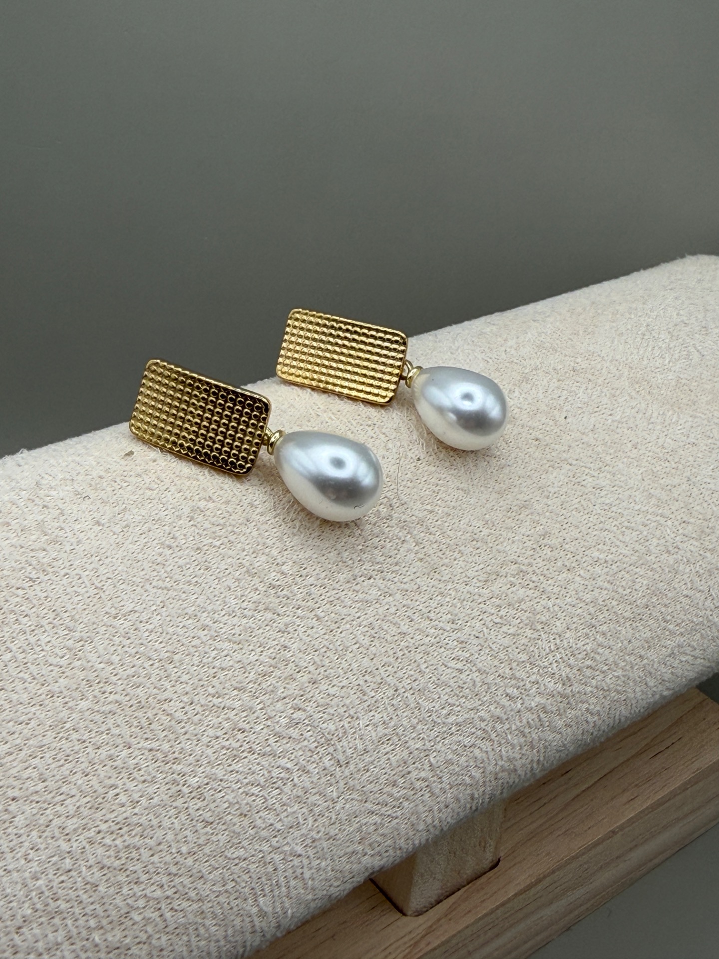 Stilrena örhängen i guldfärgad finish med mönstrad bricka och en elegant droppformad berlock i vit pärla – tidlösa och feminina.