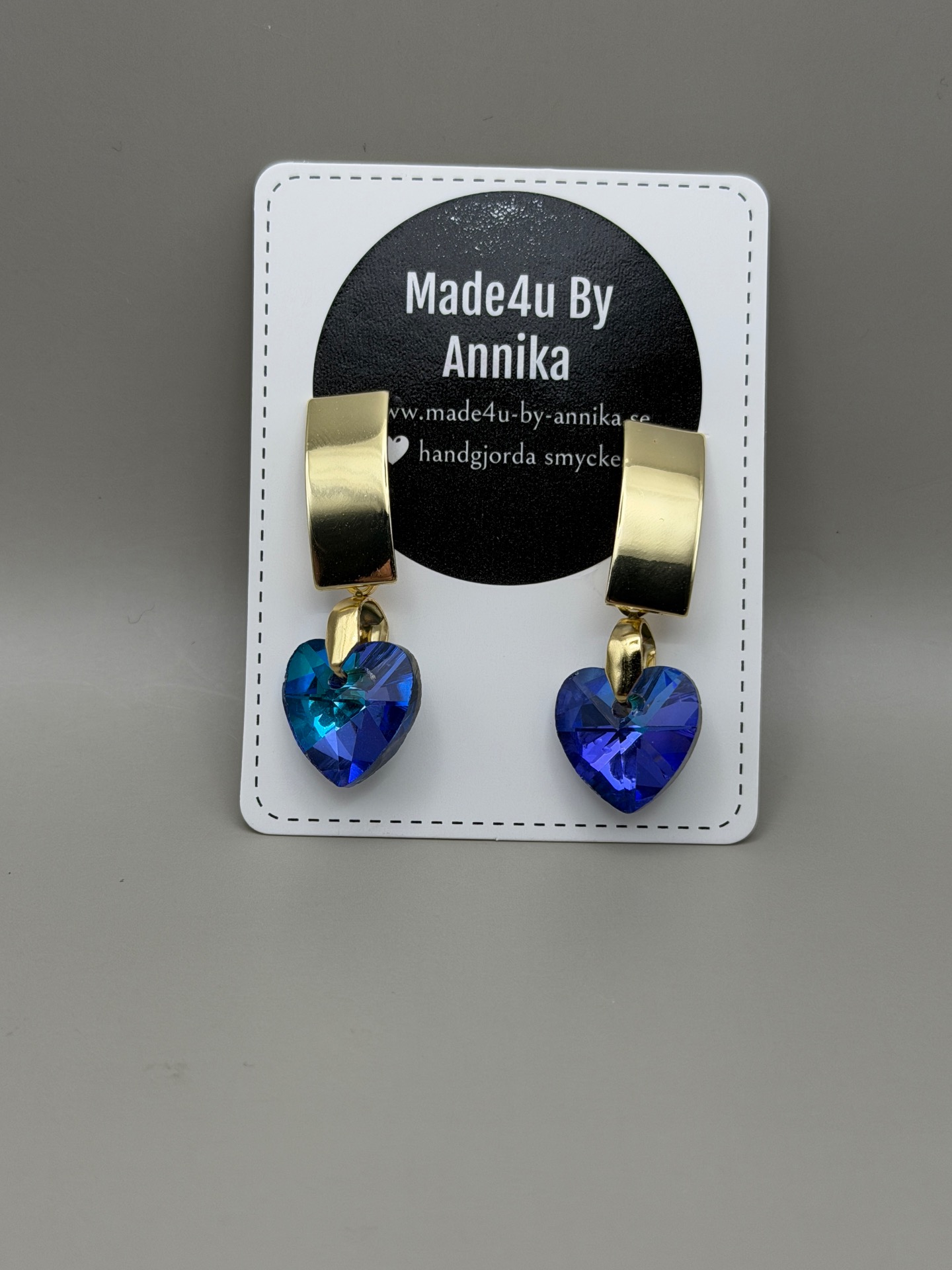 Vackra guldfärgade örhängen med vackert skimrande blått glashjärta.